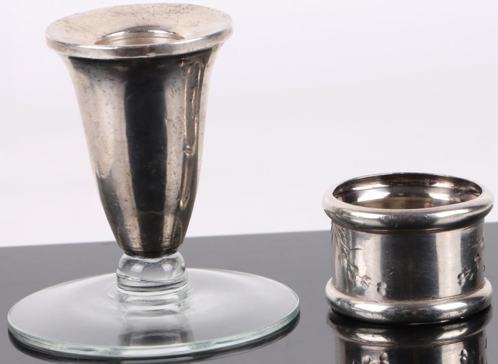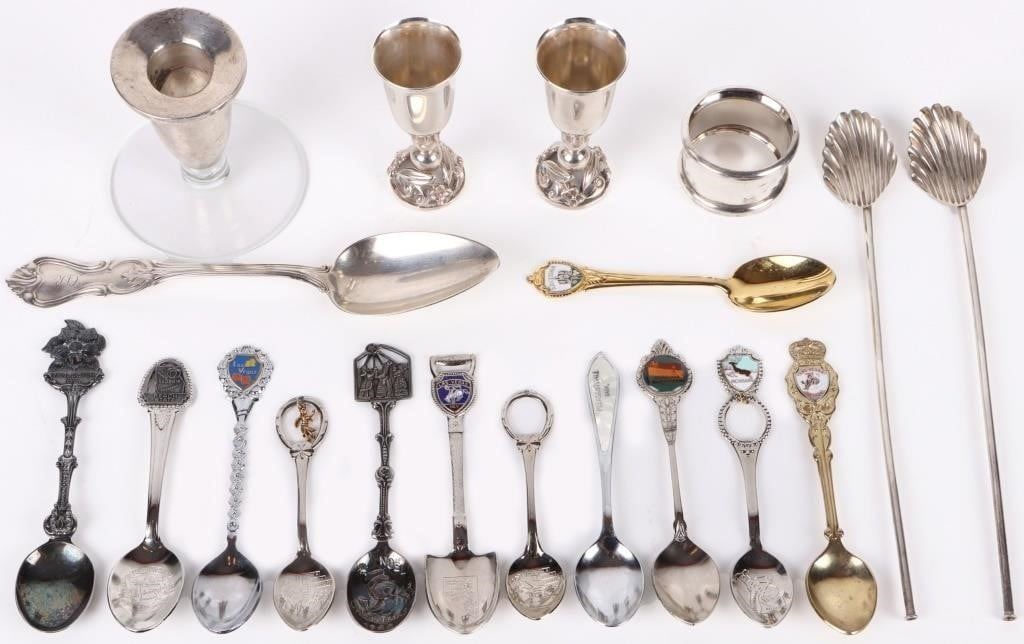 To include: Vintage Silver Tablespoon, (2) Vintage Cocktail Spoon Straws, (2) Vintage Sterling Silver Small Chalice, Silver Candle Holder w/ Glass base and Silver Napkin Ring.