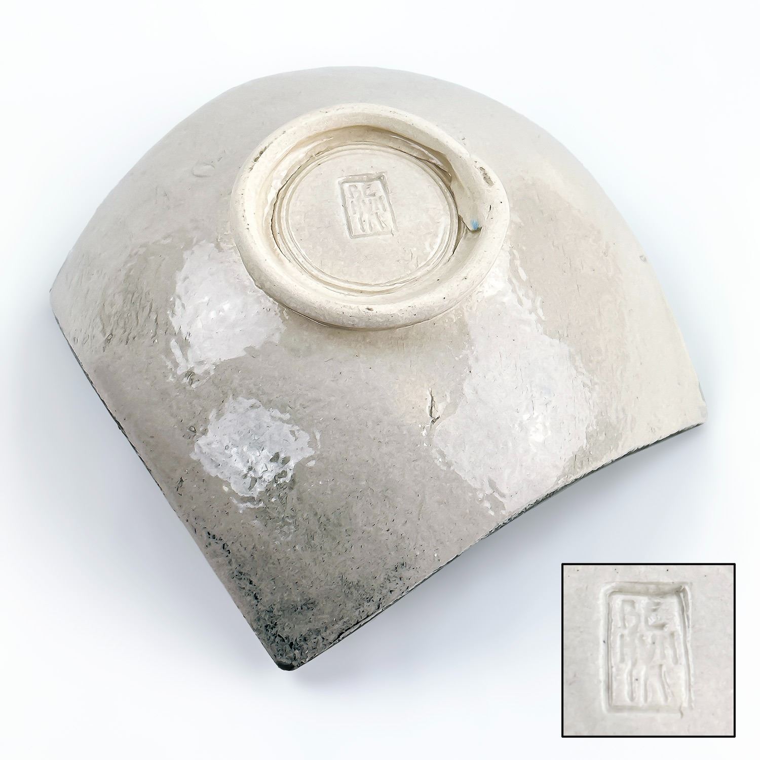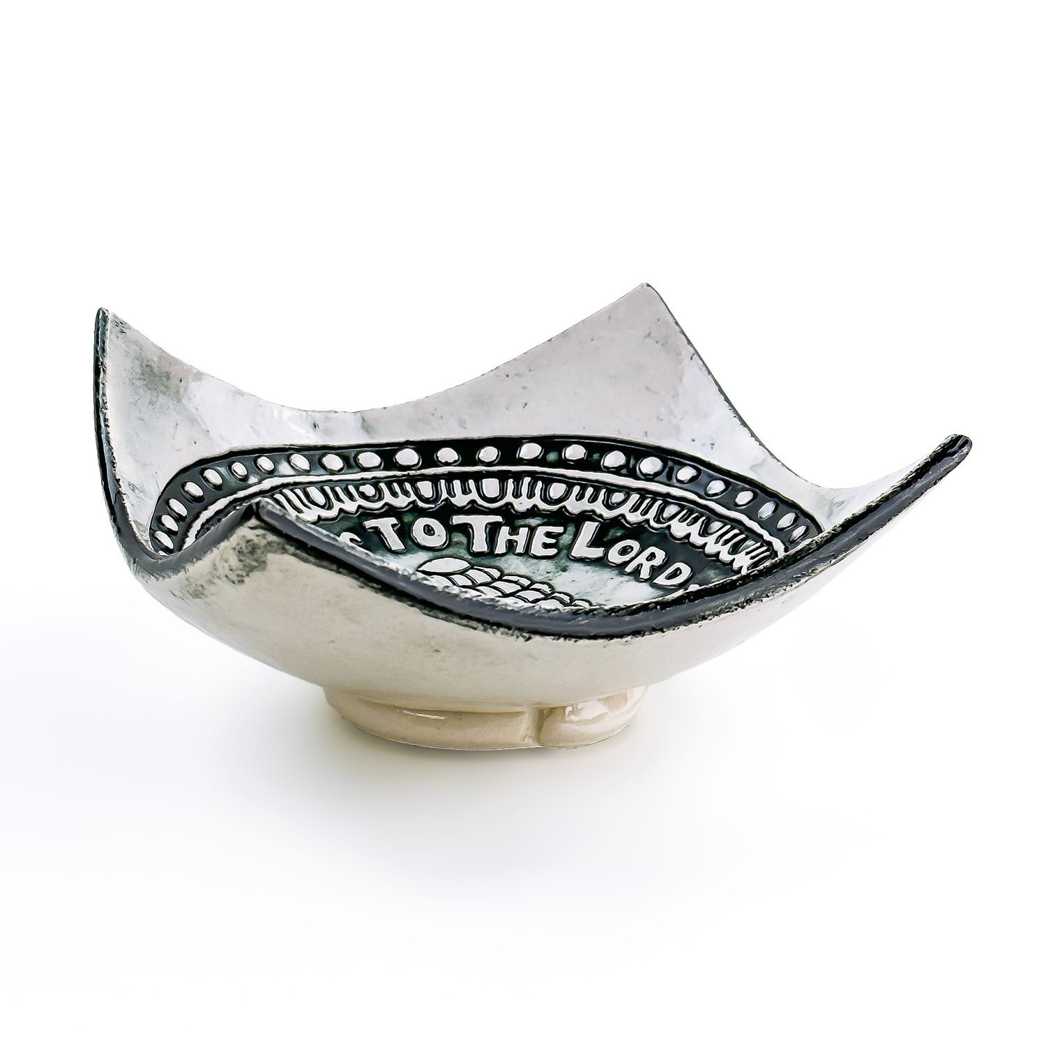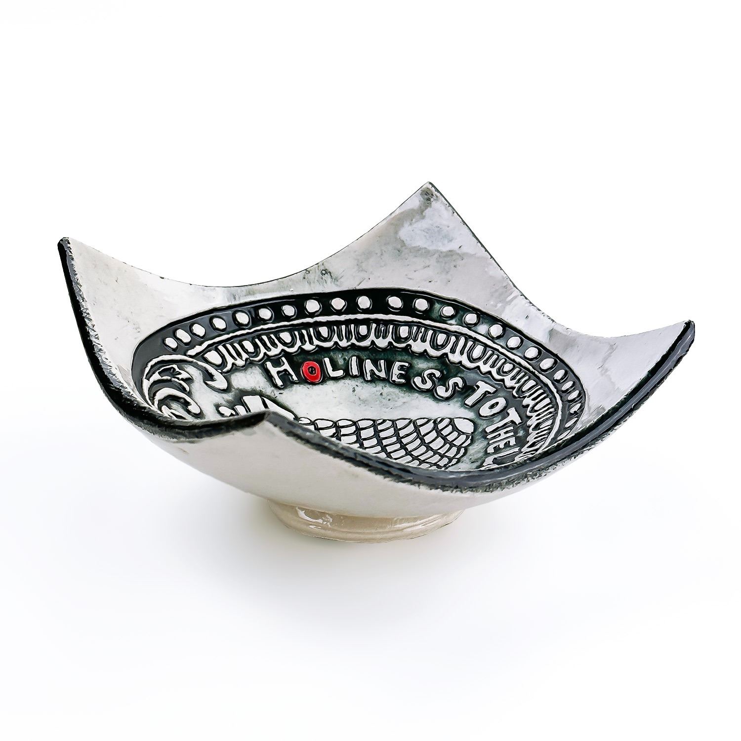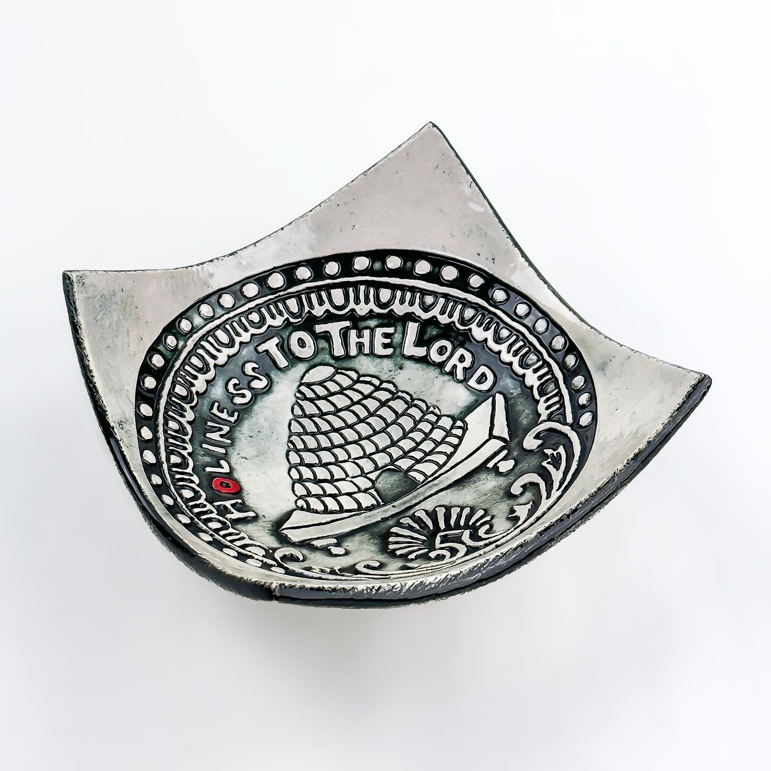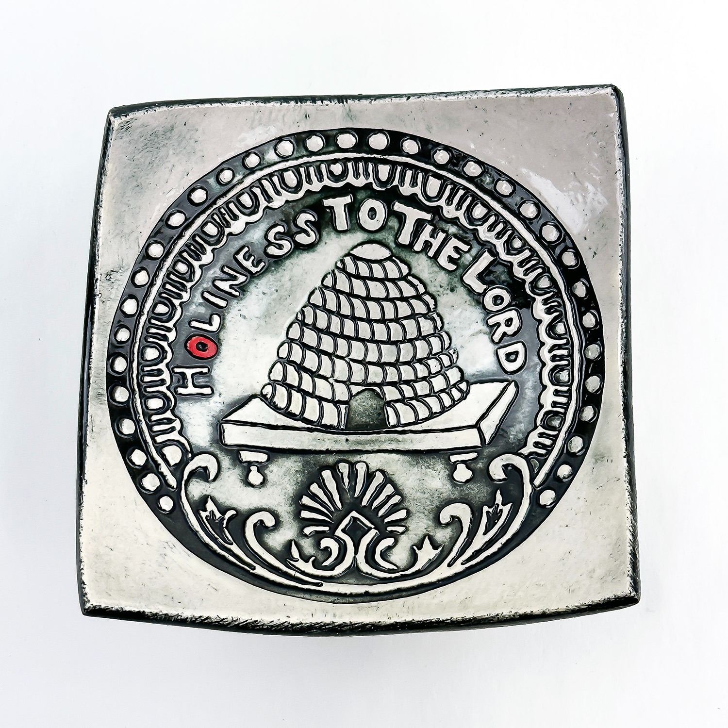 #8958 - HAND CRAFTED POTTERY TRINKET DISH SIGNED - BE HUN IN - FOR BEN BEHUNIN OF UTAH. DISH HAS A RELIGIOUS THEME “HOLINESS TO THE LORD” ALONG WITH A BEEHIVE - UTAH IS THE BEEHIVE STATE. MEASURES: 5.5” (14 CM) SQUARE AND SITS 2.75” (7 CM) HIGH