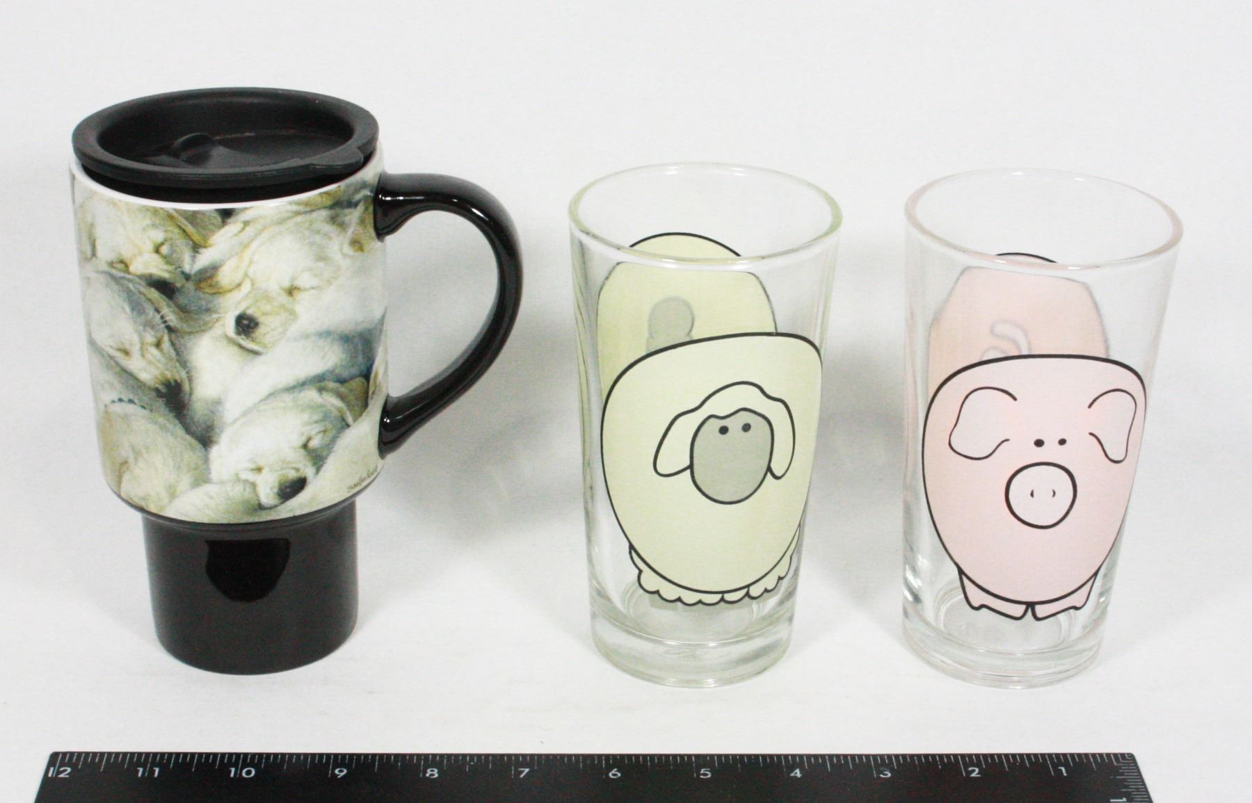 FIRNA INDONESIA FARM ANIMAL GLASSES AND A 2007 "THE LITTER" CERAMIC MUG ARTWORK BY SUEELLEN ROSS