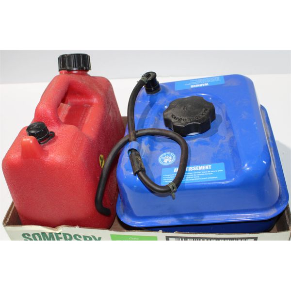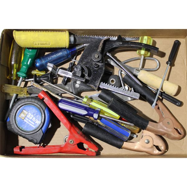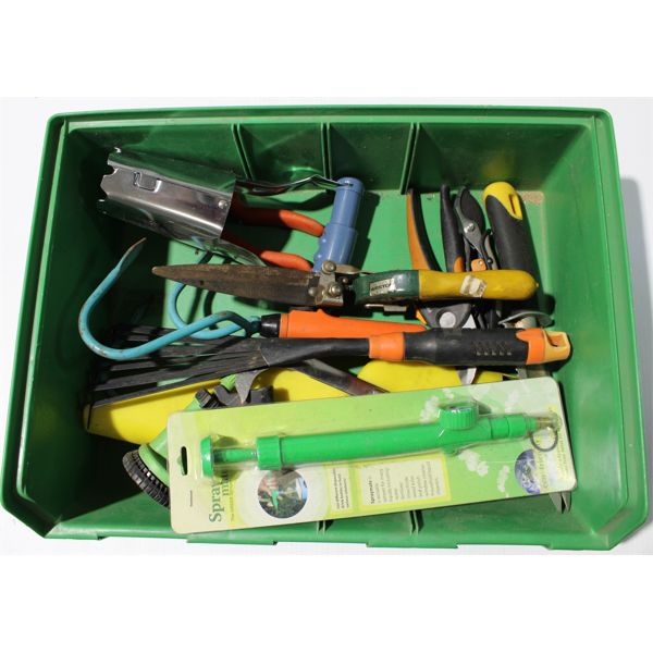 PLASTIC BIN OF GARDEN TOOLS, SHEARS, ETC.