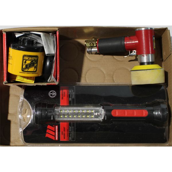 NEW MOTOMASTER LED WORK LIGHT, NEW 12 VOLT MIGHTY JUMP START & DURACELL MINI AIRPOLISHER