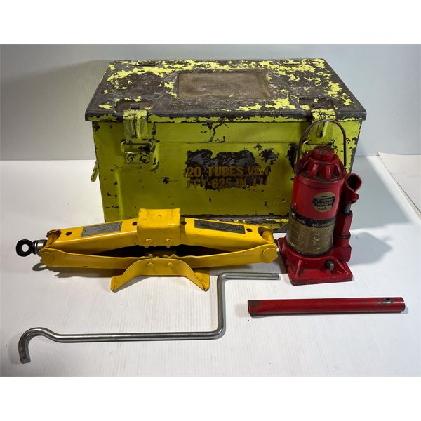 VINTAGE AMMO BOX & 5 TON BOTTLE JACK & SCISSOR JACK WITH HANDLES