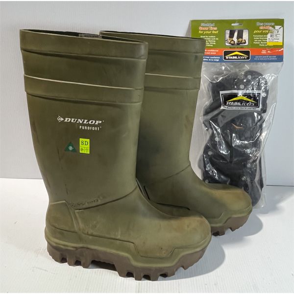 PAIR OF DUNLOP PUROFORT SIZE 10 RUBBER BOOTS & NEW STABLICERS ICE CLEATS