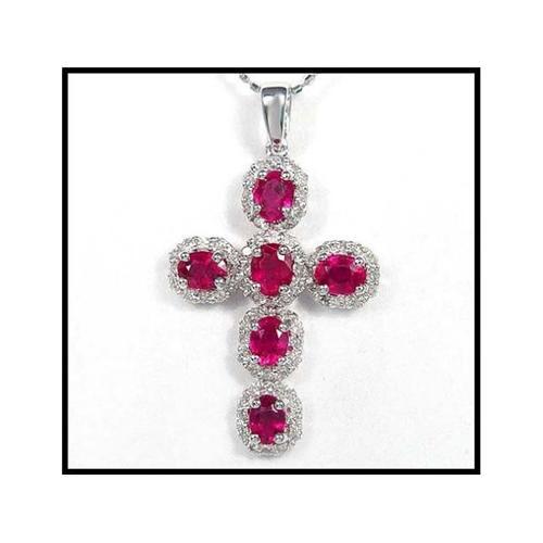 6 natural rubies exhibit spectacular color and high brilliance. The border of 72 full cut diamonds creates a lavish and elegant cross pendant as set in 18K solid white gold. It is 30mm (1 3/16") long including the bale. No chain. We never see this quality, even on sale, for less than $850. Own it for just a fraction of that now.