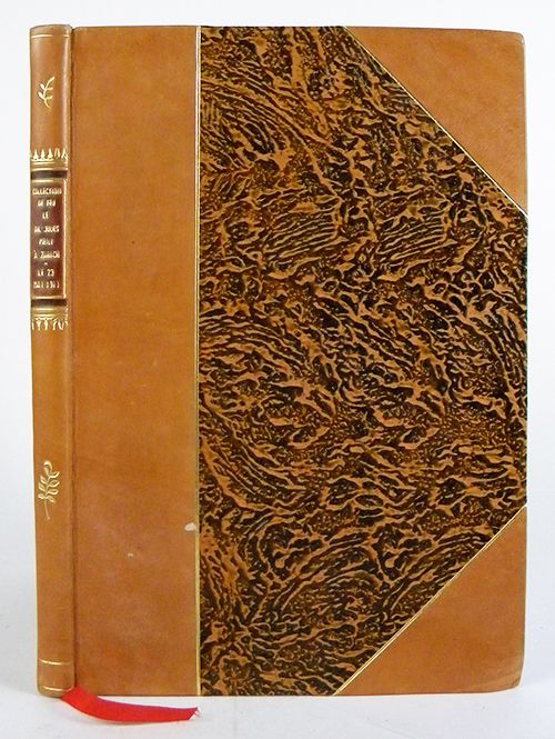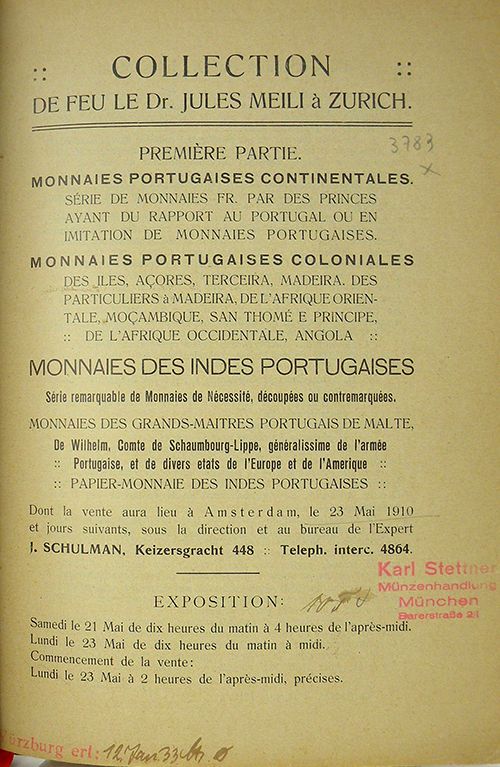 Schulman, J. COLLECTION DE FEU LE DR. JULES MEILI À ZURICH. PREMIÈRE PARTIE: MONNAIES CONTINENTALES ET COLONIALES DU PORTUGAL. SÉRIE DE MONNAIES DÉCOUPÉES OU CONTREMARQUÉES, SURTOUT DES INDES OCCIDENTALES. MONNAIES DES GRANDS-MAÎTRES PORTUGAIS DE MALTE. Amsterdam, 23 mai 1910 et jours suivants. Small 4to, later tan half calf, gilt; silk marker; original printed card covers bound in. (4), 137, (1) pages; 2519 lots; text figures; 10 fine plates of coins and medals; prices realized list. Very good or better. A classic sale. Clain-Stefanelli 11071.