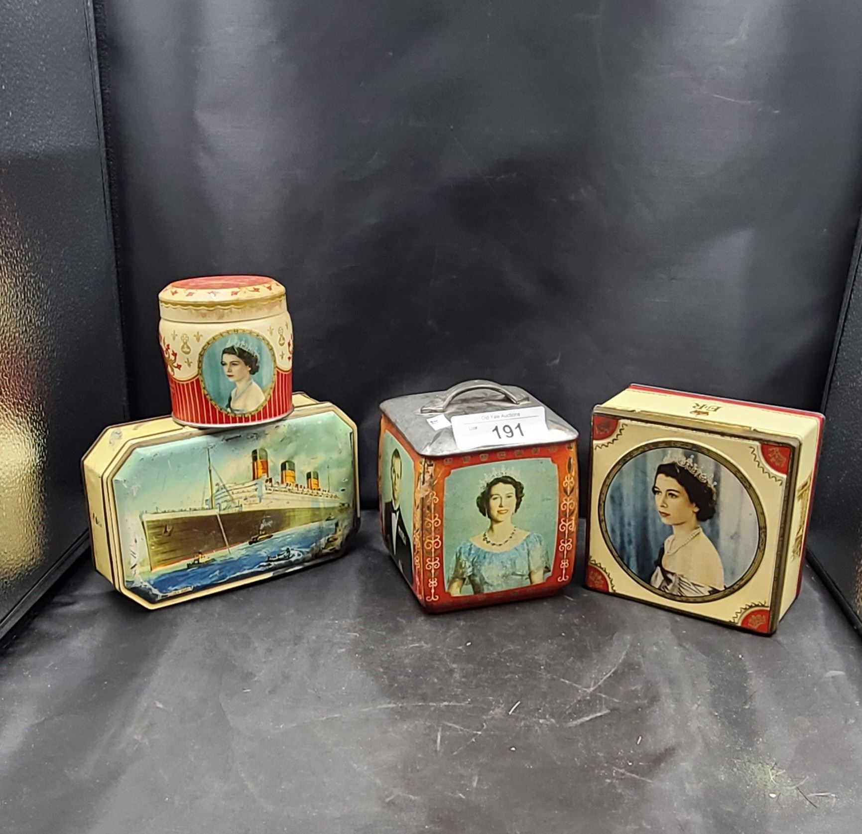 COLLECTION FOUR VINTAGE QUEEN ELIZABETH II CORONATION TINS