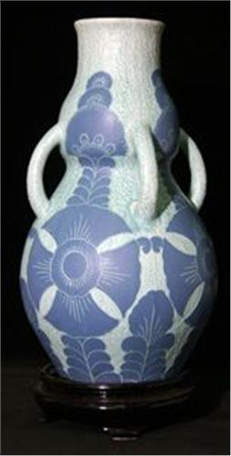 GOLVVAS, SGRAFITTO, KALEBASSFORMAD MED 4 SVÄNGDA HÄNKLAR, JOSEF EKBERG, GUSTAVSBERG, 1920, H46 (SMÄRRE GLASYRDEFEKTER)