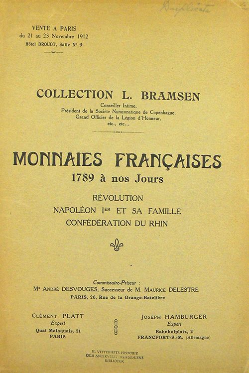 Platt, Clément, and Joseph Hamburger. COLLECTION L. BRAMSEN. MONNAIES FRANÇAISES, 1789 À NOS JOURS. REVOLUTION, NAPOLÉON 1ER ET SA FAMILLE -- CONFÉDÉRATION DU RHIN. Paris, 21-23 novembre 1912. 8vo, original printed bard covers. 75, (1) pages; 1291 lots; 8 fine plates. Binding worn at spine; essentially disbound, with signatures loose. Contents very good, but in need of binding. Scarce. Grierson 290.