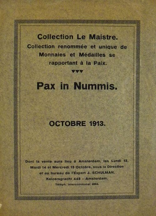 Schulman, J. COLLECTION LE MAISTRE. COLLECTION RENOMMÉE ET UNIQUE DE MONNAIES ET MÉDAILLES SE RAPPORTANT À LA PAIX. PAX IN NUMMIS. Amsterdam, 13-15 Octobre, 1913. Small 4to, original printed card covers. (2), 256, 34 pages; 1314 lots; halftone text illustrations; 4 halftone plates of medals. Plates badly chipped; covers worn and reinforced with plastic. Good only. The very scarce sale catalogue of this remarkable collection.