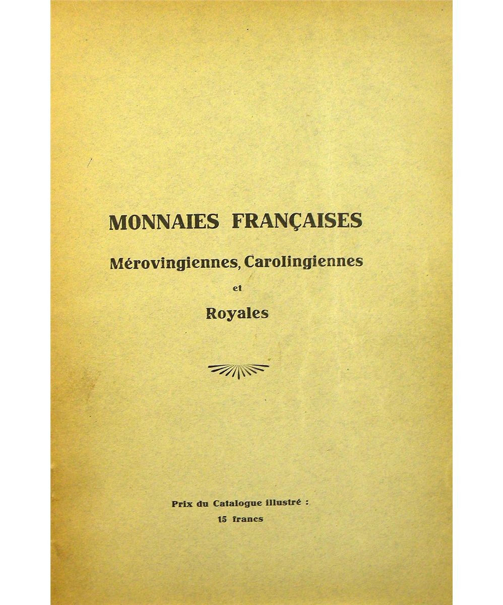 Platt, Clément. COLLECTION B. MONNAIES FRANÇAISES. MÉROVINGIENNES, CAROLINGIENNES ET ROYALES. EN VENTE AUX PRIX MARQUÉS. Paris, undated. Small 4to, original printed card covers. 63, (1) pages; 1525 listings; 8 fine plates. Corner bump, else near fine. A rare fixed-price catalogue with very fine plates.