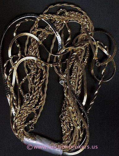 COLLECTION OF 12 GOLD PLATED CHAINS INCLUDING ROPE, SERPENTINE, TWISTED HERRINGBONE, AND MORE. TEN CHAINS MEASURE 16 INCHES AND TWO CHAINS MEASURE 20 INCHES.