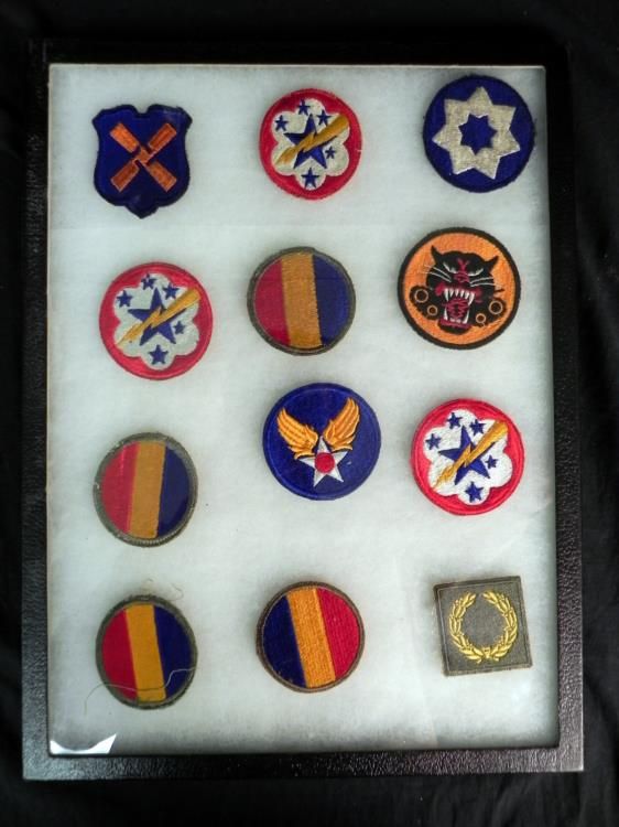 COLLECTION OF 12 WWII PATCHES IN RIKER MOUNT CASE