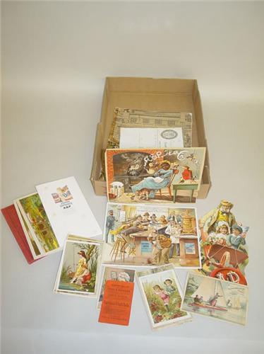 COLLECTION OF (19) MISC. A & P ADVERTISING COLLECTIBLES INCLUDING 19TH CENT. TRADE CARDS, NEEDLE CASE, SMALL FORMATE BOOKS, 1872 RECEIPT W/ BILL HEAD, 70TH ANNIVERSARY BOOK "3 SCORE YEARS & 10", EARLY PUZZLE CARD PREMIUM, ETC.