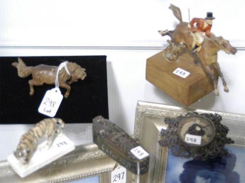 COLLECTION OF 3 BRONZES AND A RELIC including one cold painted and one Vienna, 3 1/2" to 6" long, condition: small loss to fox hunter, tiger with chip to ear, PACKING AND SHIPPING (excluding insurance) $25,