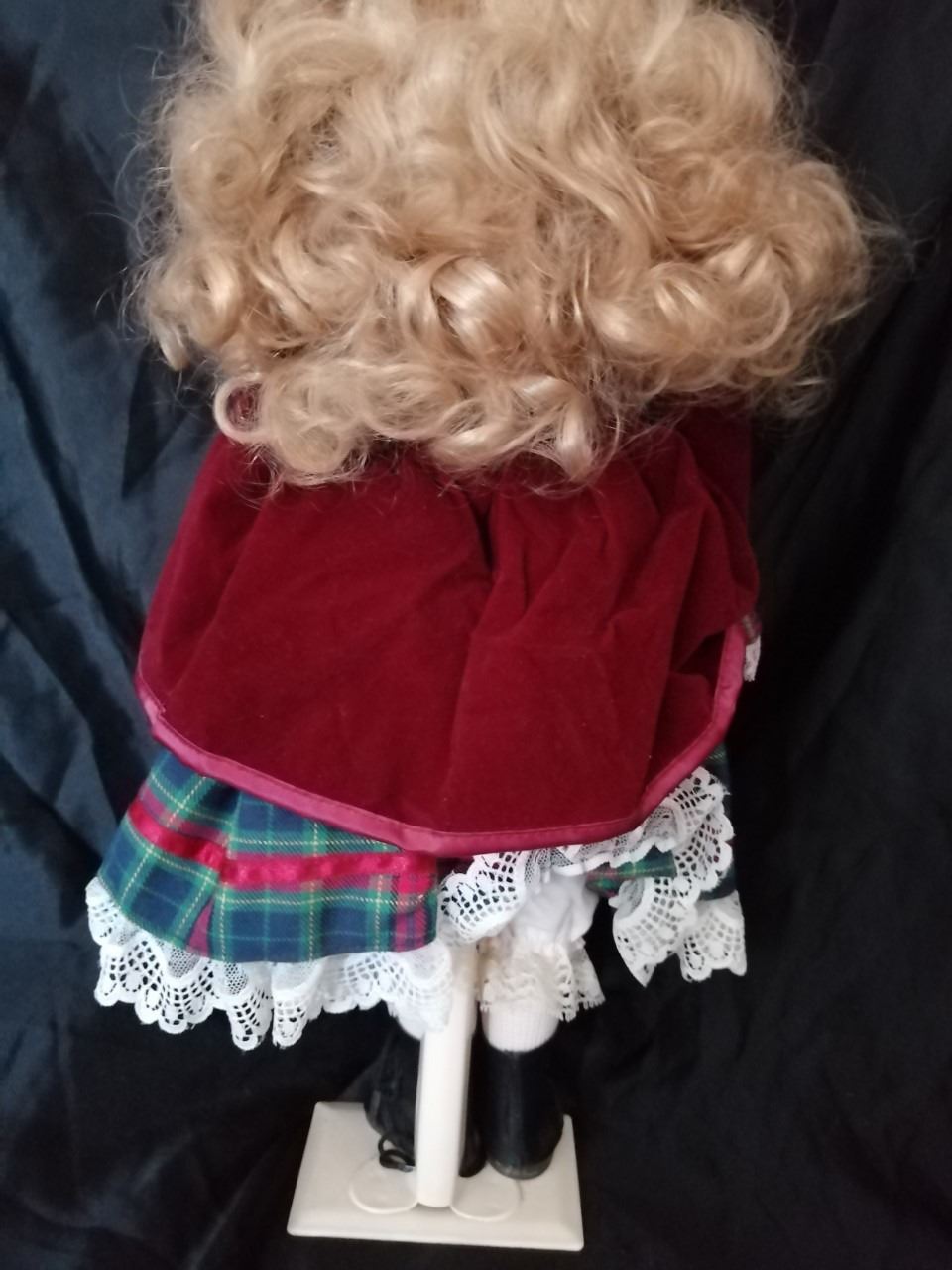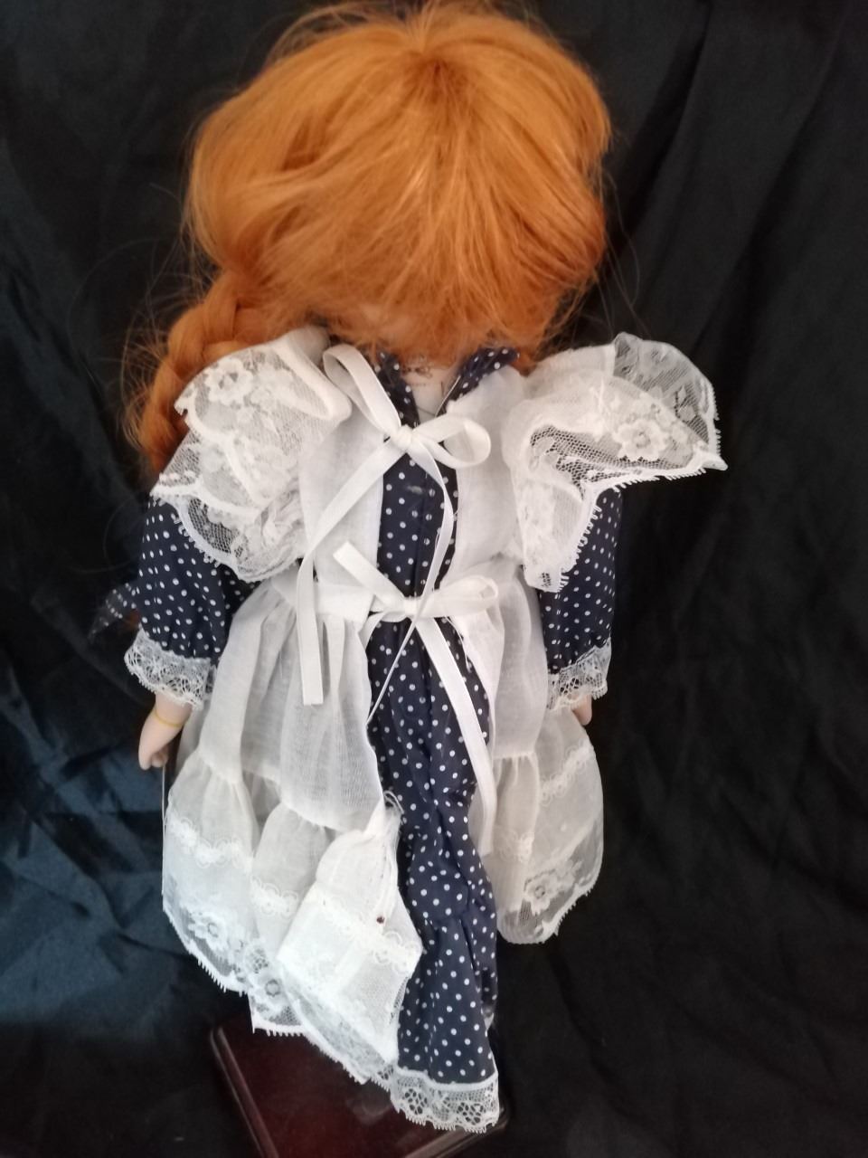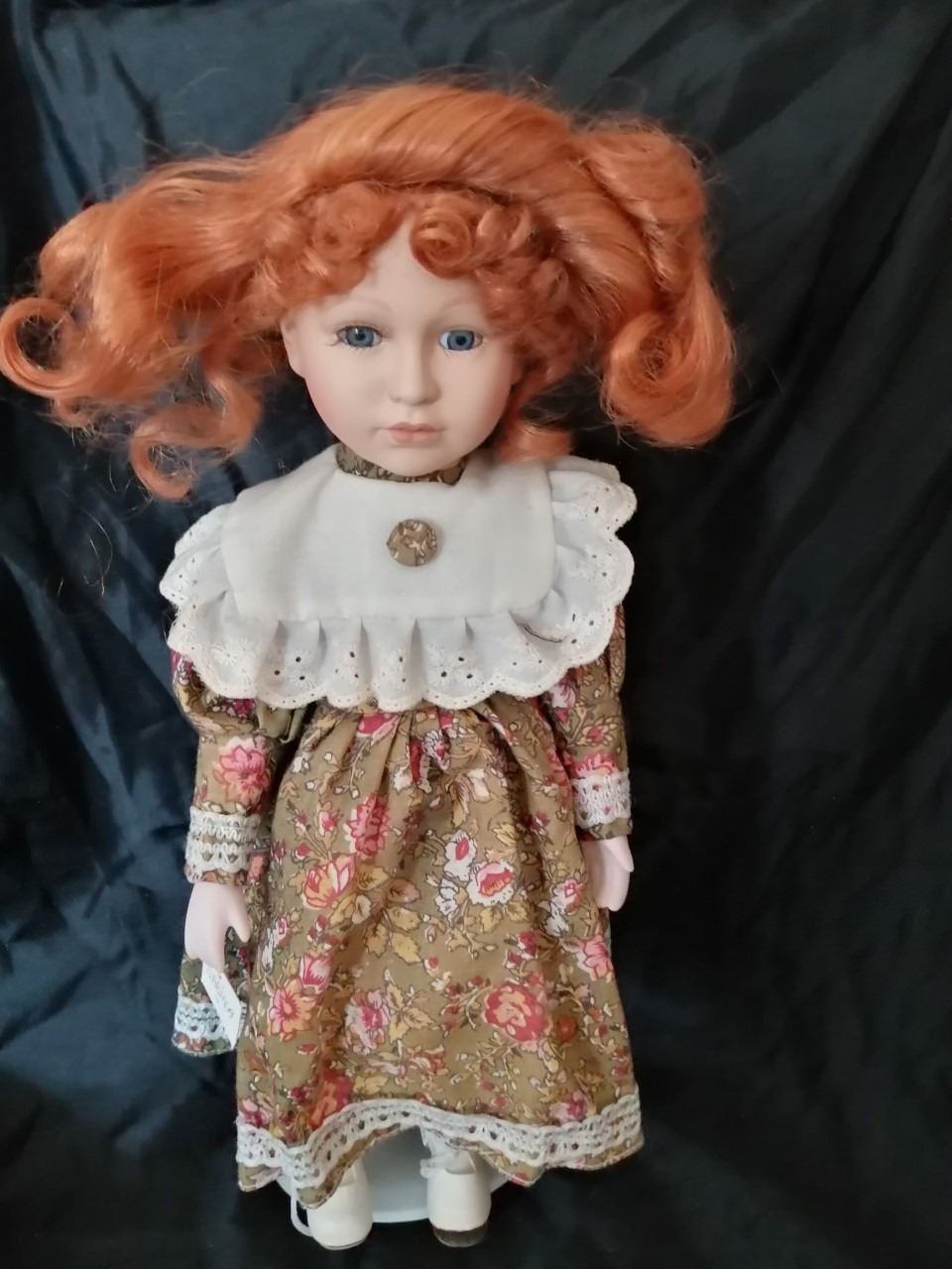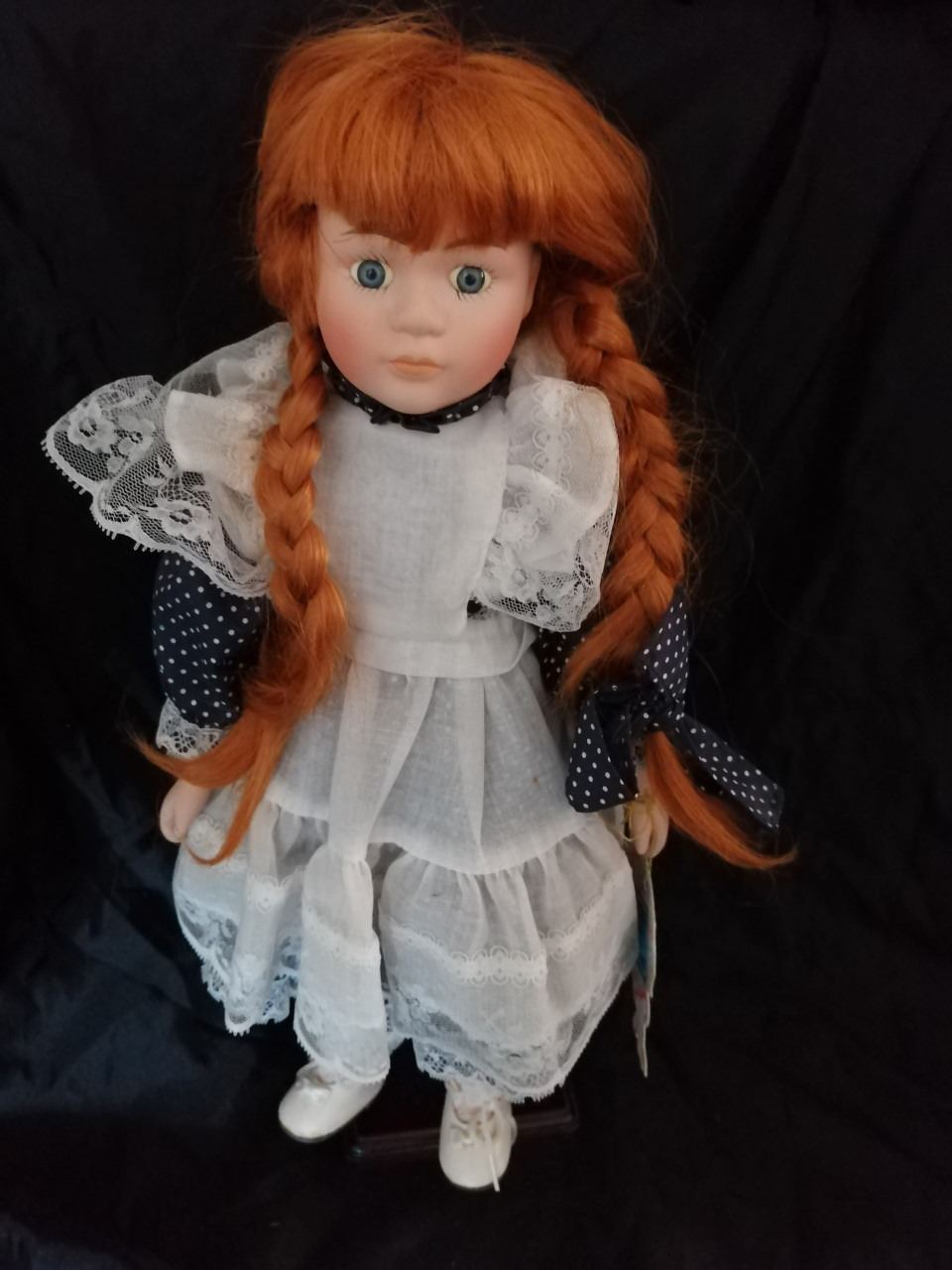 4 Porcelain dolls, all on stands. 2x16 inches, 1x17 inches and another 18.5 inches, Including stands. Shoe's splitting on one, and all boxes are tatty.
