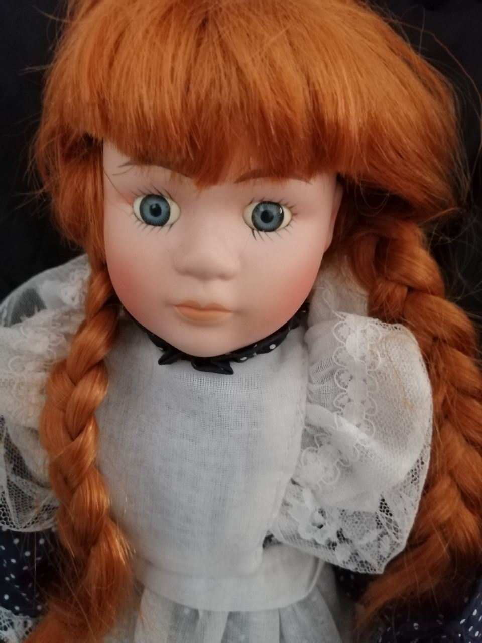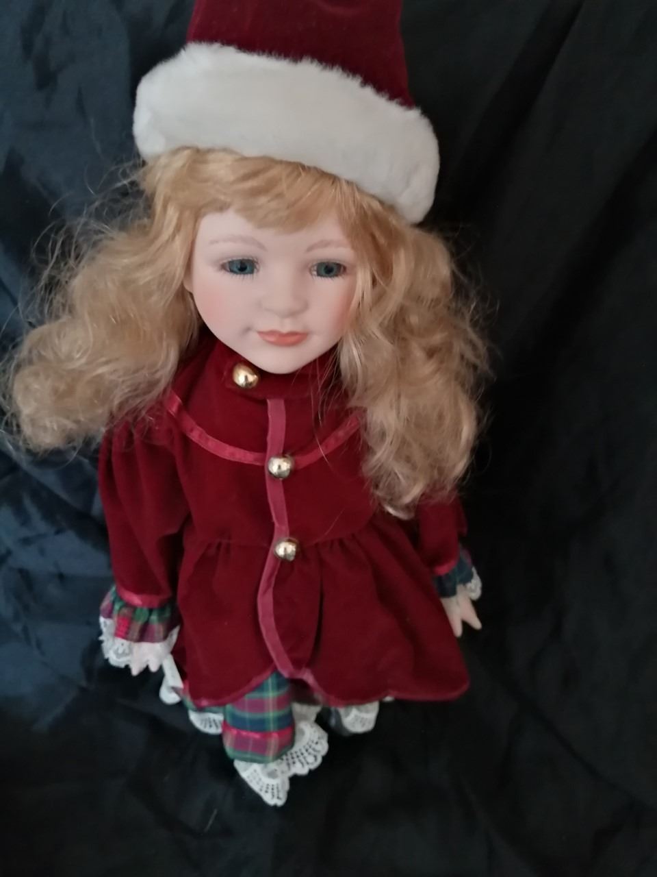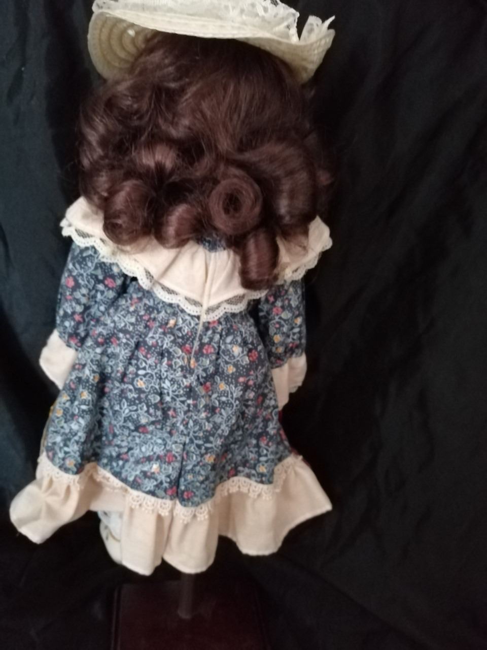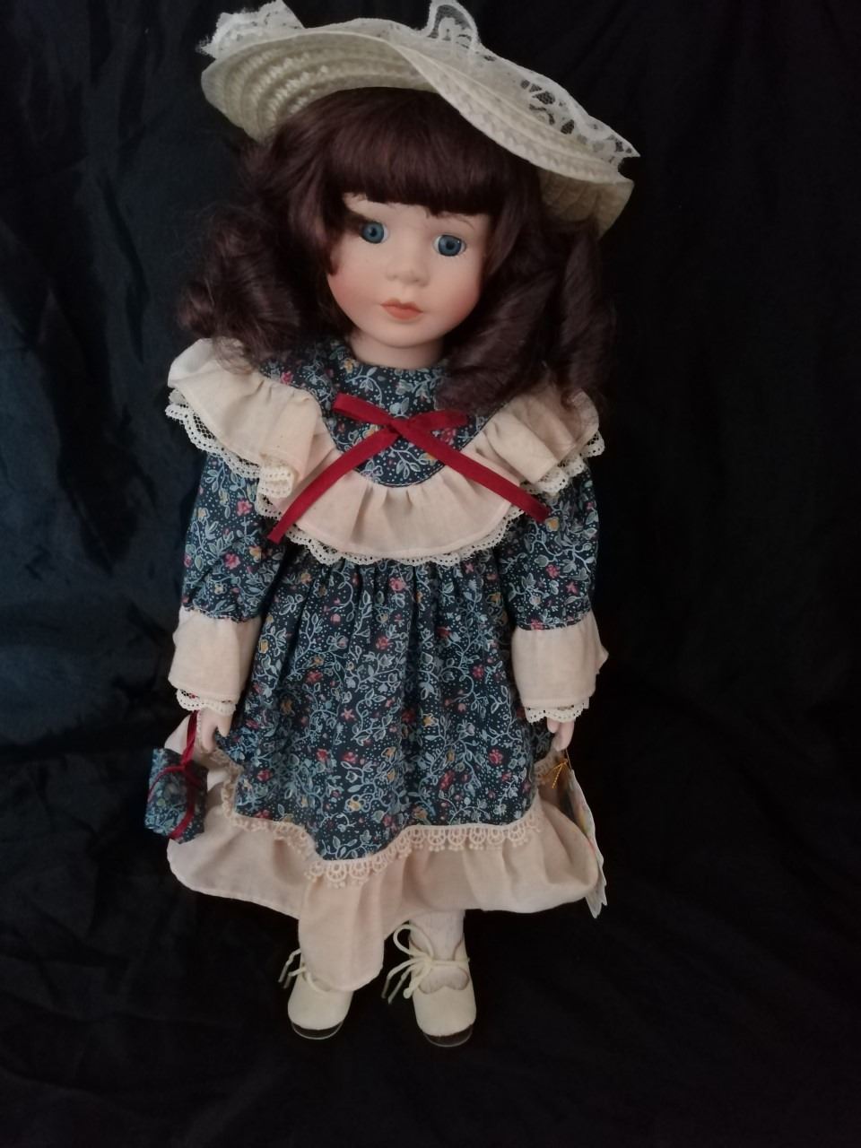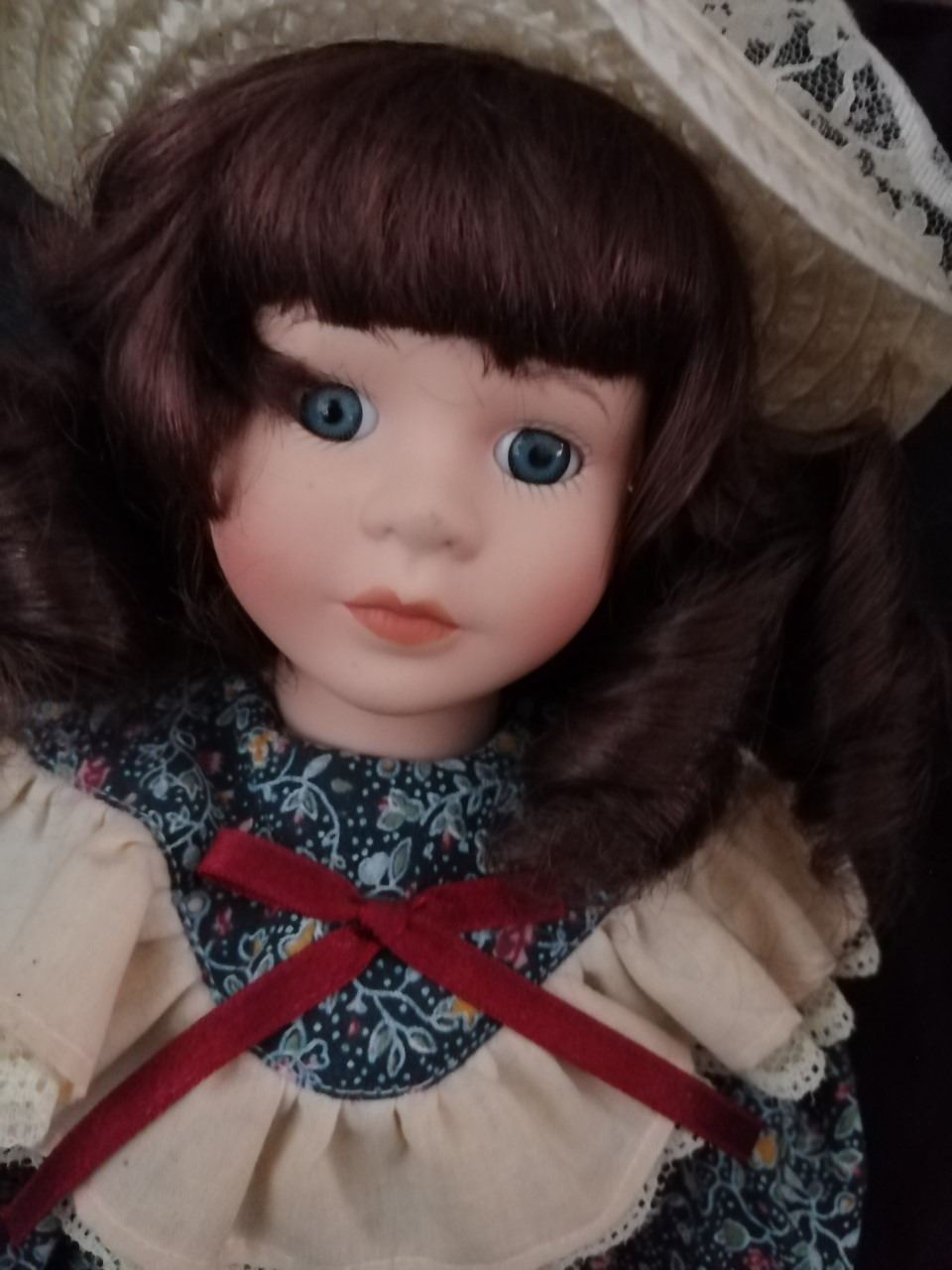 4 Porcelain dolls, all on stands. 2x16 inches, 1x17 inches and another 18.5 inches, Including stands. Shoe's splitting on one, and all boxes are tatty.