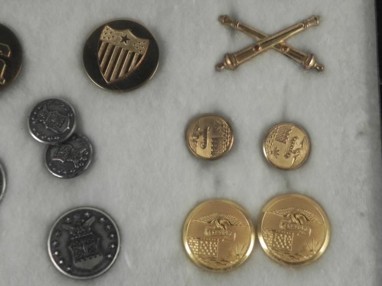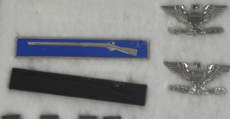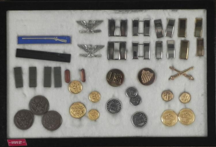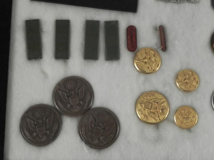 COLLECTION OF 40+ WWII U/S/ MILITARY INSIGNIA, AWARDS, BUTTONS. RANK BARS, ETC * A FULL CASE COLLECTION OF MILITARIA *