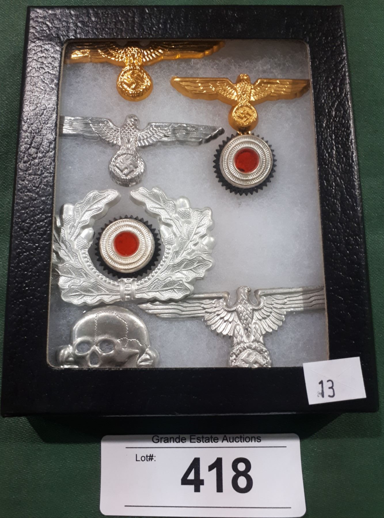 COLLECTION OF 6 WWII NAZI PINS IN DISPLAY BOX - REPRODUCTION