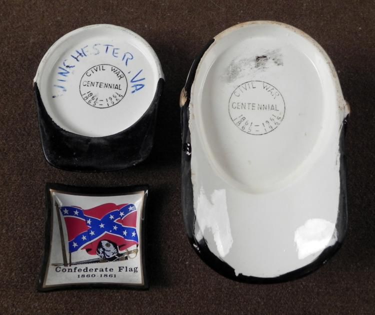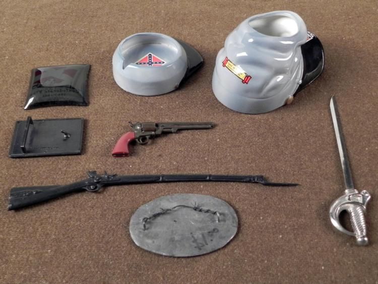 OFFERED HERE IS A COLLECTION OF 8 CIVIL WAR CONFEDERATE ITEMS. THERE ARE 2 CSA KEPI ASHTRAYS, A MINI SWORD (CONFEDERATE WHITE HOUSE -RICHMOND), MINI SHARPS RIFLE & REVOLVER, AND CSA BUCKLES. ALL OF THE ITEMS ARE ABOUT 50 YEARS OLD. *