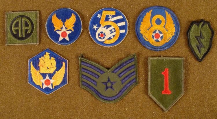 OFFERED HERE IS A COLLECTION OF EIGHT U.S. PATCHES-5TH, 6TH, 8TH AF-AA-1 DIV-25 DIVISION-++. THE PATCHES ARE PROBABLY FROM VIETNAM OR LATER. *