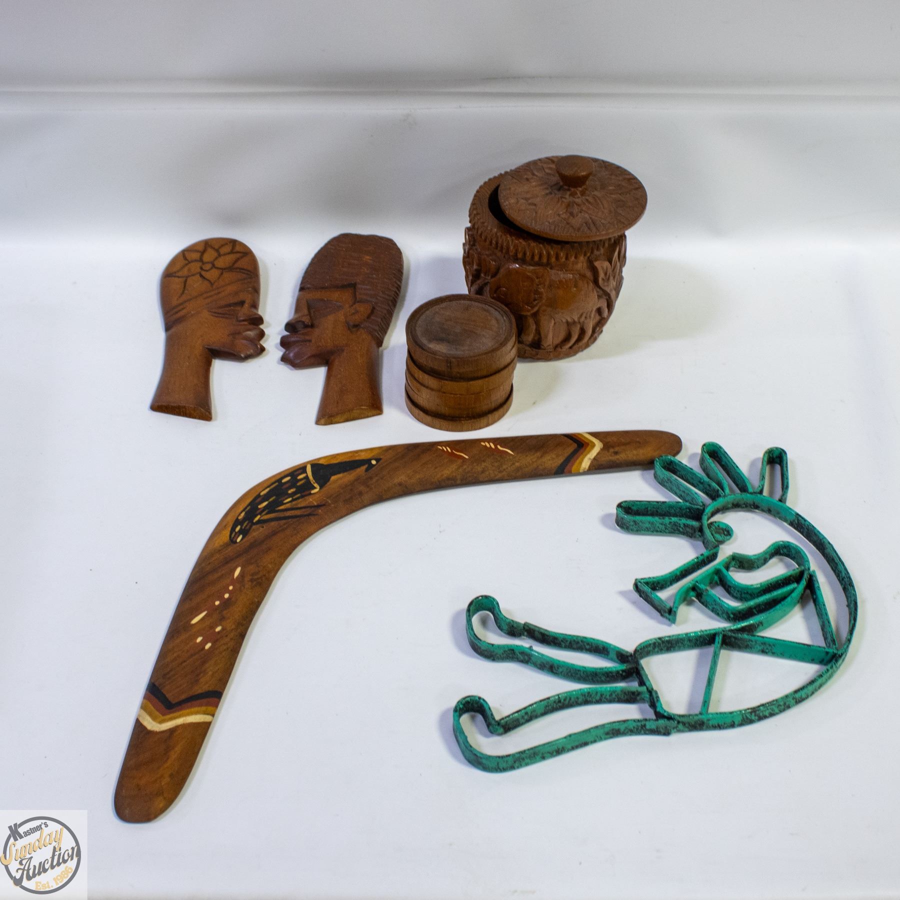 FLAT WITH WOODEN BOOMERANG, WOODEN COASTER SET IN A LIDDED WOODEN HOLDER, 2 WOODEN CARVED FACE WALL HANGINGS MALE + FEMALE & METAL KOKAPELI WALL DECOR HANGING **ALL ITEMS MUST BE REMOVED BY 5PM SATURDAY, APRIL 18TH 2026. ALL REMAINING ITEMS WILL BE SUBJECT TO A $6.00 PER DAY STORAGE CHARGE. ANY ITEMS REMAINING AFTER MONDAY, MAY 4TH 2026 WILL BE CONSIDERED FORFEITED. NO REFUNDS WILL BE ISSUED FOR FORFEITED ITEMS. TO SCHEDULE A PICK UP APPOINTMENT CLICK HERE