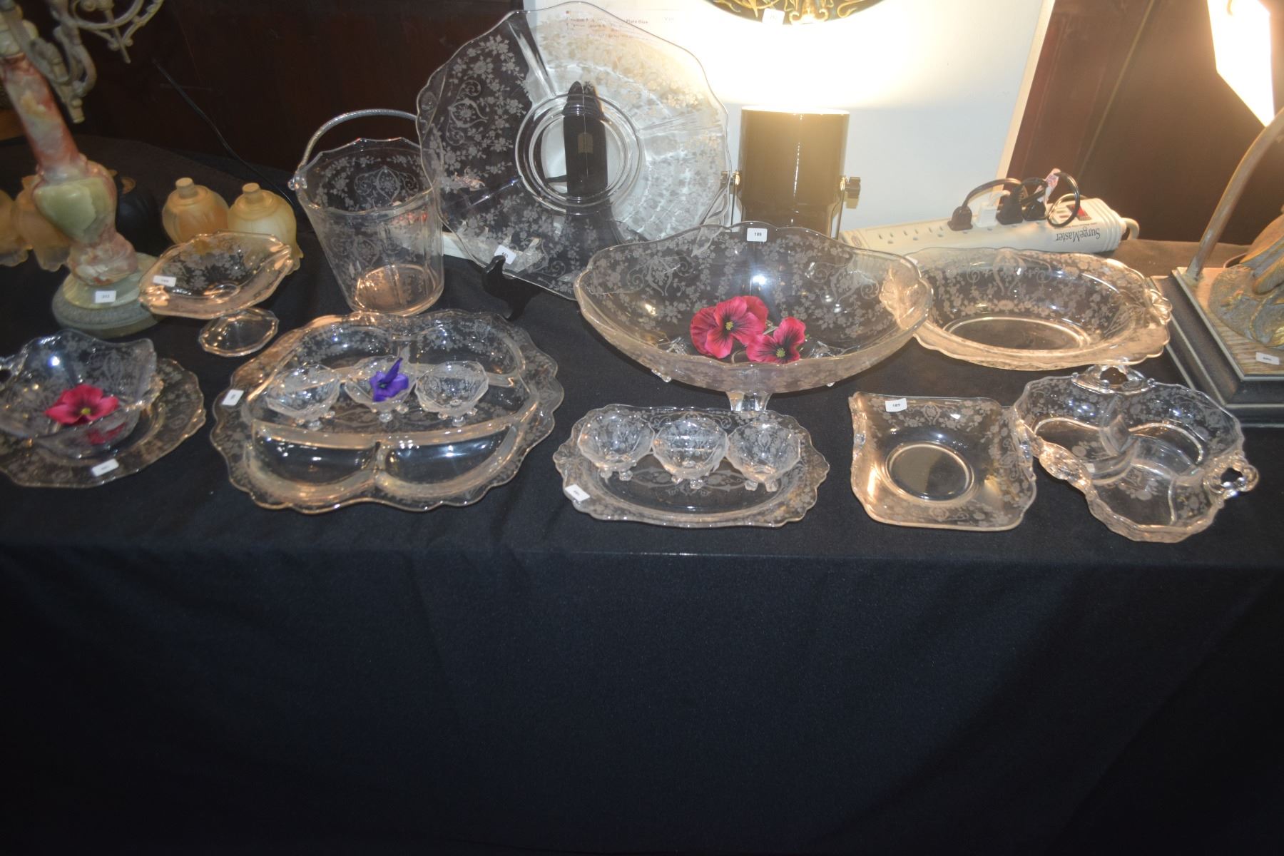 COLLECTION OF CAMBRIDGE WILD FLOWER ETCHED GLASS PLATES, BOWLS & SERVING PIECES (17 PCS) (DOES NOT I