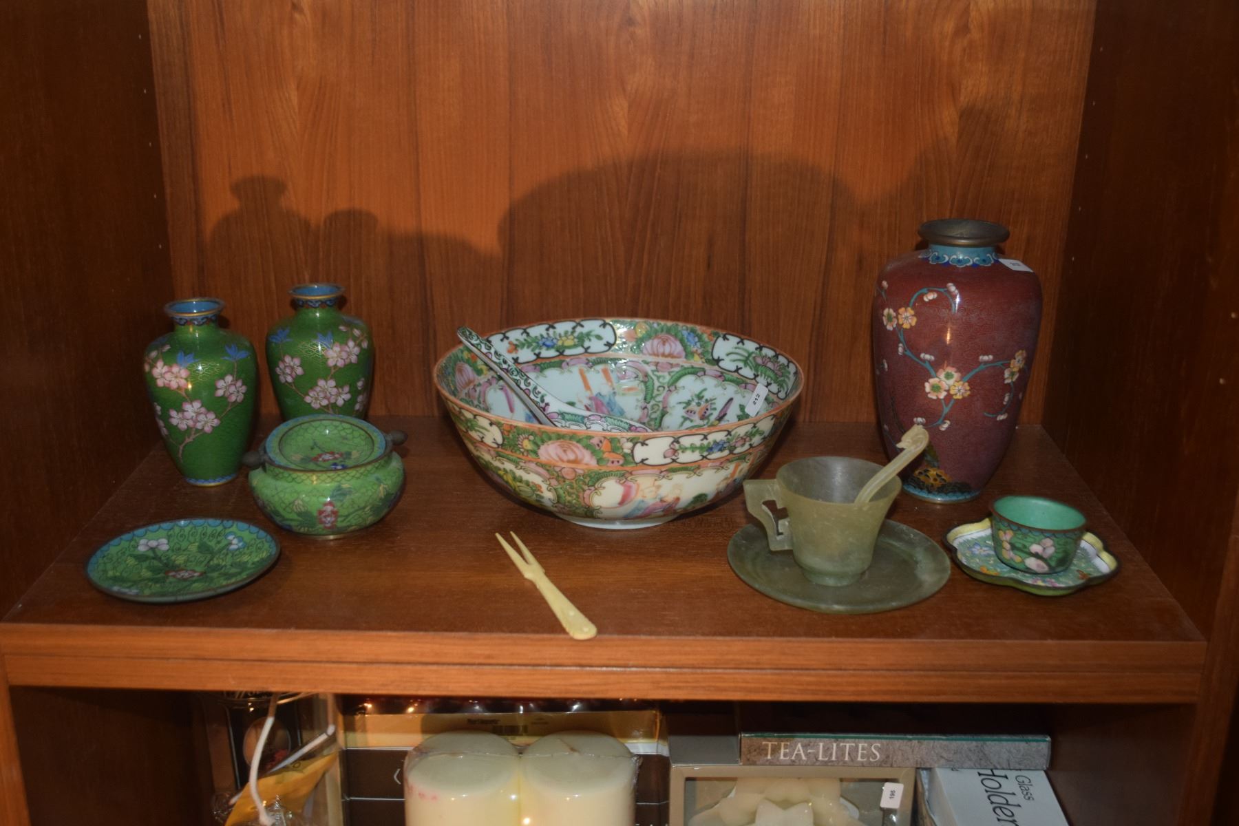 COLLECTION OF CLOISONNE VASES, CUP, PLATE, FAMILLE ROSE BOWL & SPOON, STONE CUP, SAUCER & SPOON (11