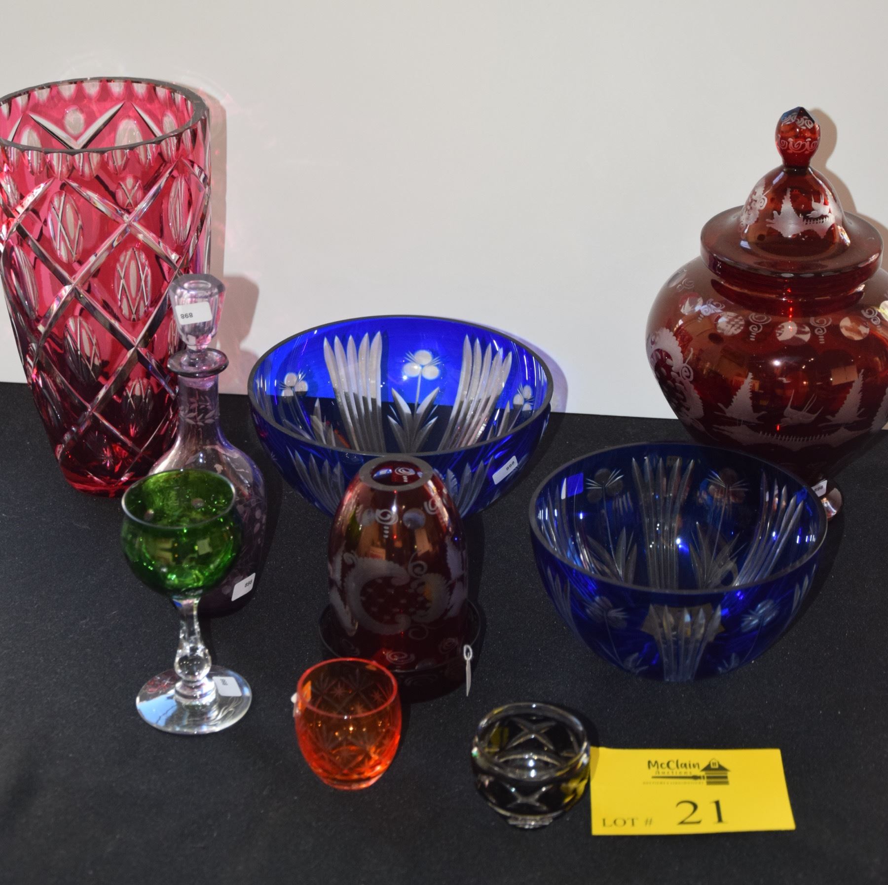 COLLECTION OF COLORED CRYSTAL & GLASS, CUT TO CLEAR BOWLS, VASE, CRUET, VOTIVE & GLASSES (10 PCS)