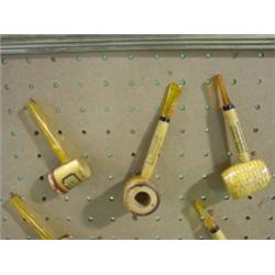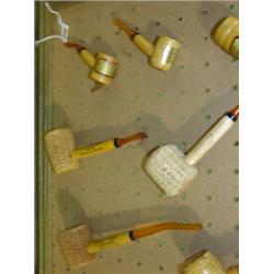 COLLECTION OF 10 CORN COB PIPES on framed peg board. 19.25" x 22.5" frame.