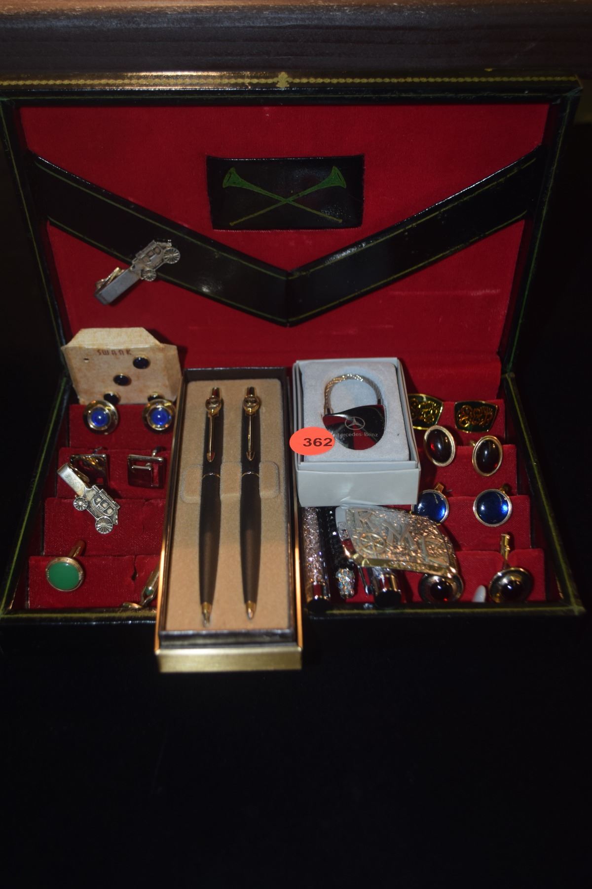 COLLECTION OF CUFF LINKS, PENS, TIE CLIPS & MERCEDES KEY RING IN DRESSER BOX