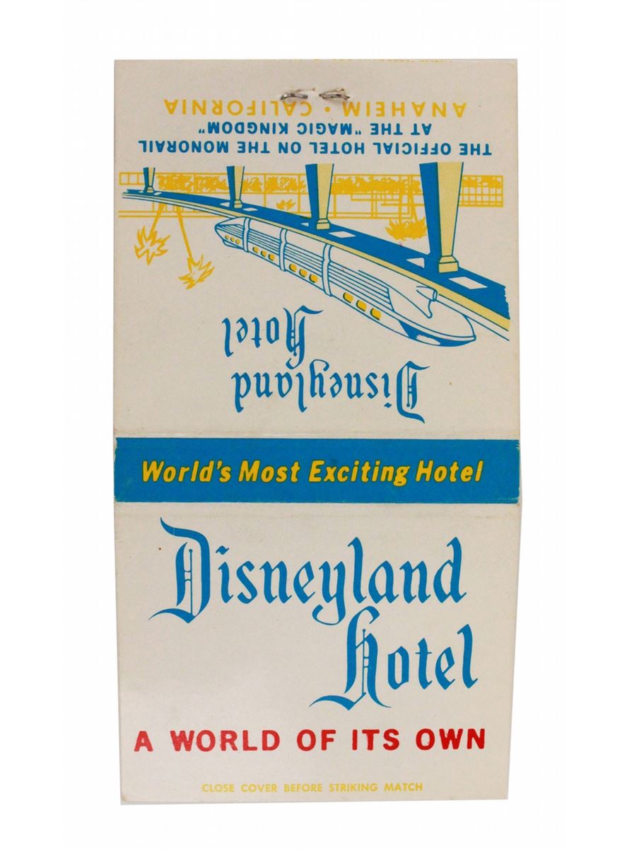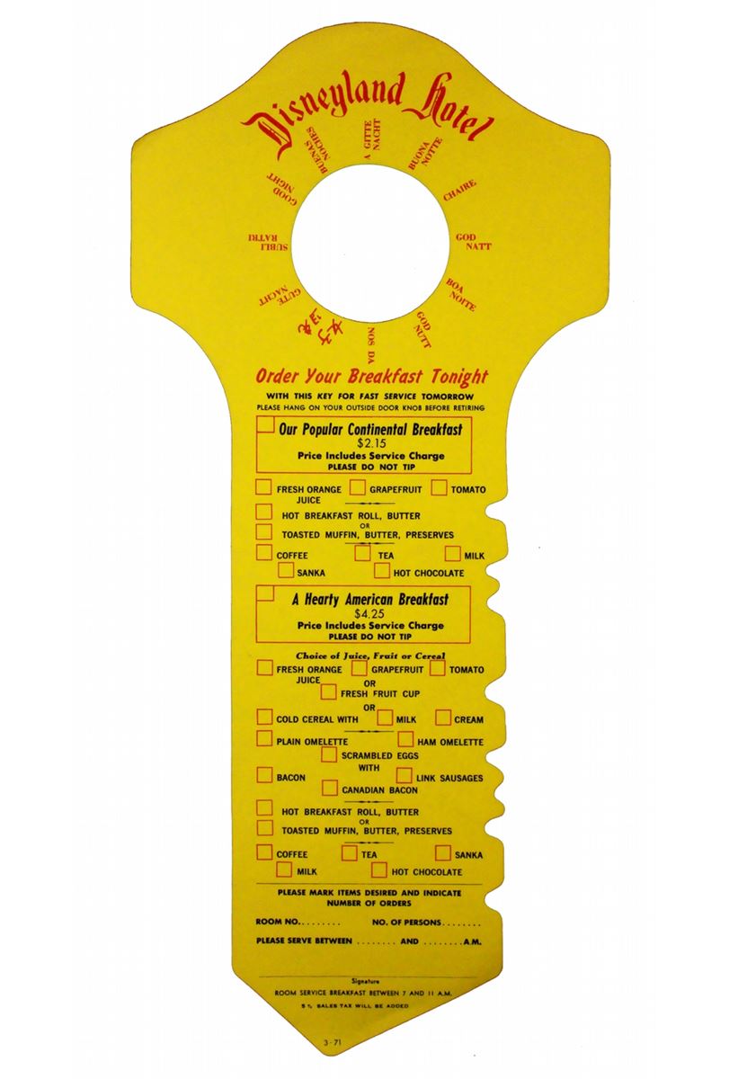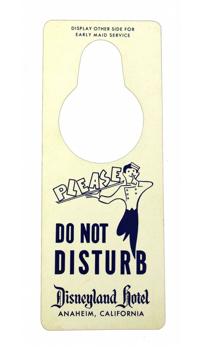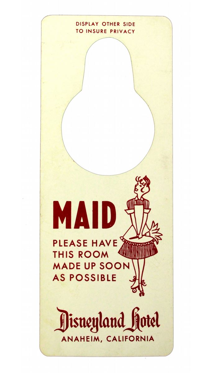 (Disneyland, 1962) Nice grouping of Disneyland Hotel memorabilia including a room service breakfast card, Do not Disturb Sign, matchbook cover, rate card and more.