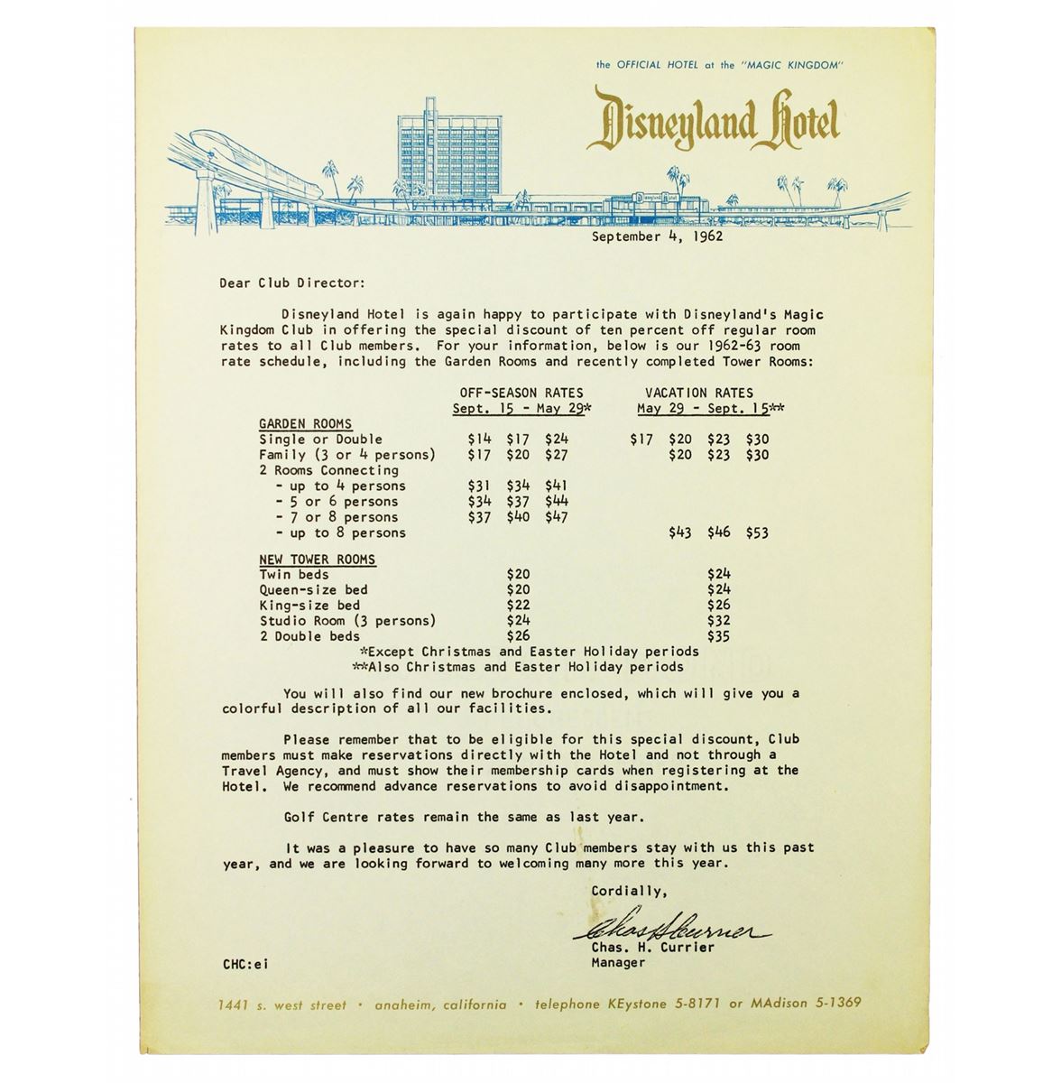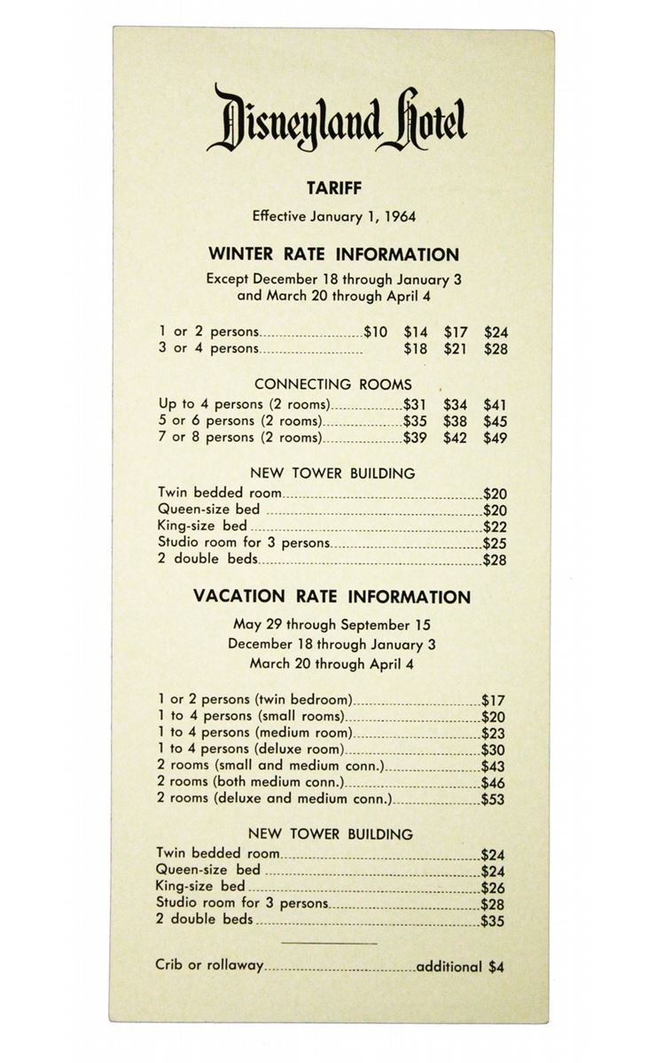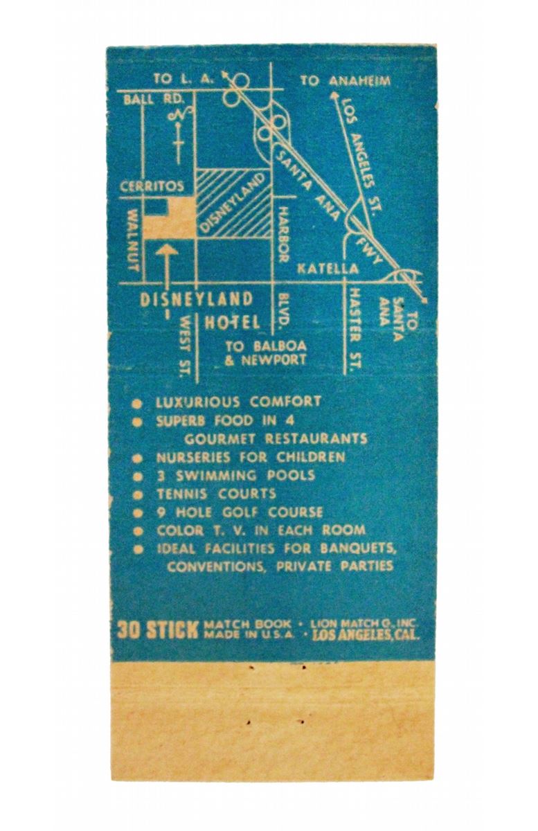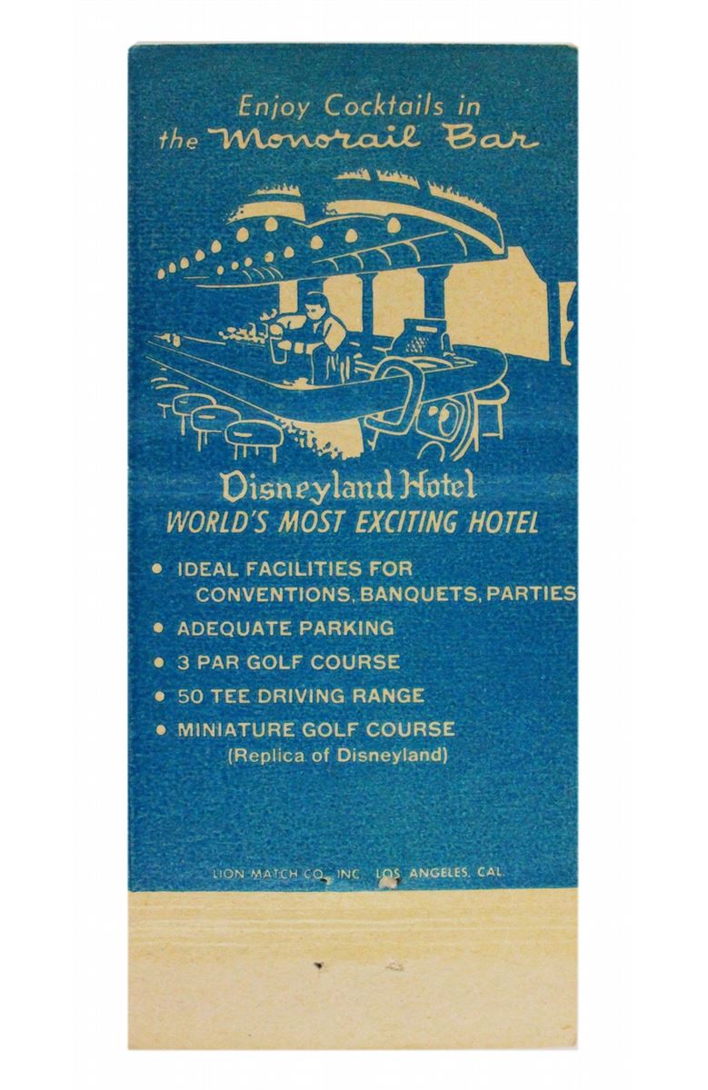 (Disneyland, 1962) Nice grouping of Disneyland Hotel memorabilia including a room service breakfast card, Do not Disturb Sign, matchbook cover, rate card and more.
