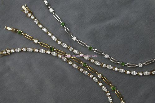 COLLECTION OF FOUR (4) FASHION BRACELETS ALL IN A STERLING BASE, TWO PLATED IN YELLOW GOLD. TWO OF THE BRACELETS ARE IN THE TENNIS STYLE WITH MARQUISE AND ROUND CUT CUBIC ZIRCONIA'S, THE OTHERS HAVE ALTERNATING GREEN STONES.
