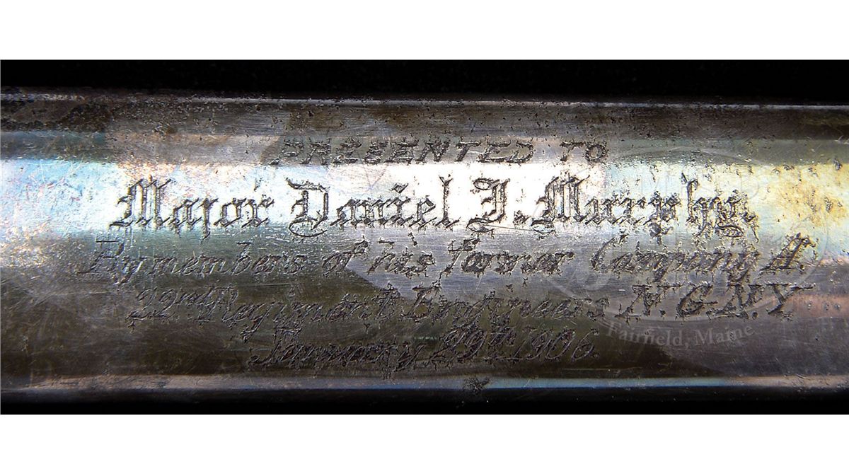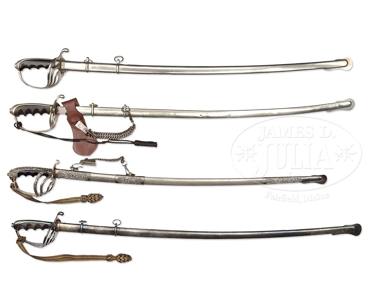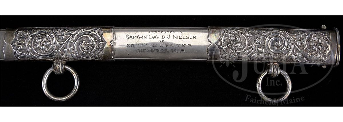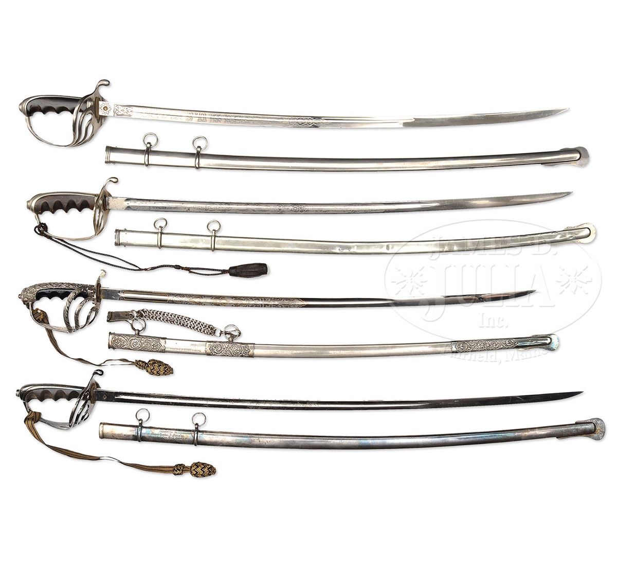 If you ever wanted to collect regulation pattern 1902 swords this is an opportunity to buy four of the best in one lot. 1) High grade eagle pommel presentation to "Capt. David Nielson, Company M, 14th New York National Guard, Christmas 1929" This is a lovely sword in near new condition with relief florally decorated mounts and hilt. Eagle head terminates into feathered backstrap and beautifully silver plated like the rest of the sword. The 30" blade has large etched panels with gold highlights with Nielson's name again engraved in presentation panel. This sword also retains a bullion sword knot and a patented sword hanger. 2) Presentation on scabbard with a shaped horn grip. Sword is presented to Capt. Charles P. Hunt by Company E of the 1st Regiment National Guard Pennsylvania. Sword is etched and agent marked "Horstmann Philadelphia". 3) French made import with horn grip and silver plate is presented to Major Daniel Murphy of the 22nd Regiment of Engineers of the New York National Guard in 1906. This is a very early example of a 1902 being presented in 1906. This sword is accompanied by bullion sword knot and a patented 2-strap sword hanger. 4) Springfield Armory regulation issued 1902 with horn grip. Blade is like new with full luster. Accompanied by a very early first model German silver scabbard. Attached leather sword hanger has the name Donald P. Strausbaugh, Chevy Chase, Maryland. A leather sword knot accompanies this sword. CONDITION: 1) Nielson sword; overall is in very fine condition, retaining 90%+ orig plate. Blade is bright, retaining almost all gold highlights and orig polish. 2) Hunt sword; fine to excellent overall. Blade retains most of orig luster. Plating is 95% retained, though dull and bubbling in areas. 3) Murphy sword; very good to fine overall. Blade has been buffed and has pitting. Silver plating to hilt and scabbard have staining and bubbling, though plating is mostly retained. 4) Springfield sword; fine to excellent overall. Blade retains most orig luster with staining and pitting. Grip is solid but has several scuffs and chips. First Model Scabbard is fine, cleaned with numerous small dings and nicks from being carried. 4-47321 JS24