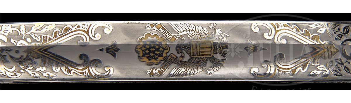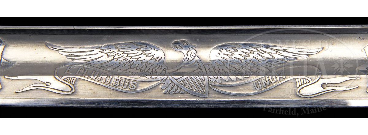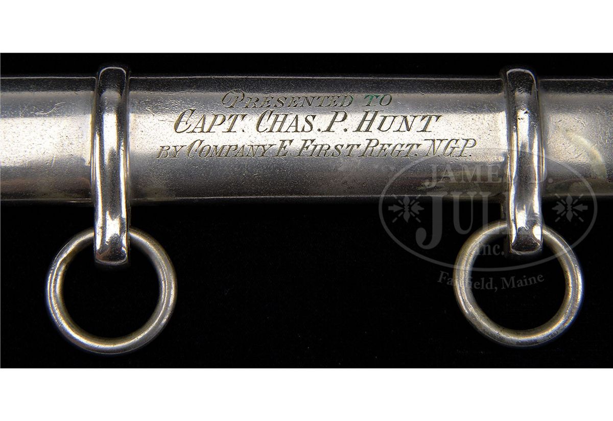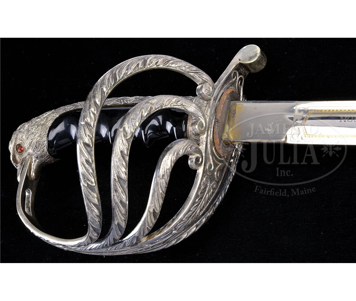 If you ever wanted to collect regulation pattern 1902 swords this is an opportunity to buy four of the best in one lot. 1) High grade eagle pommel presentation to "Capt. David Nielson, Company M, 14th New York National Guard, Christmas 1929" This is a lovely sword in near new condition with relief florally decorated mounts and hilt. Eagle head terminates into feathered backstrap and beautifully silver plated like the rest of the sword. The 30" blade has large etched panels with gold highlights with Nielson's name again engraved in presentation panel. This sword also retains a bullion sword knot and a patented sword hanger. 2) Presentation on scabbard with a shaped horn grip. Sword is presented to Capt. Charles P. Hunt by Company E of the 1st Regiment National Guard Pennsylvania. Sword is etched and agent marked "Horstmann Philadelphia". 3) French made import with horn grip and silver plate is presented to Major Daniel Murphy of the 22nd Regiment of Engineers of the New York National Guard in 1906. This is a very early example of a 1902 being presented in 1906. This sword is accompanied by bullion sword knot and a patented 2-strap sword hanger. 4) Springfield Armory regulation issued 1902 with horn grip. Blade is like new with full luster. Accompanied by a very early first model German silver scabbard. Attached leather sword hanger has the name Donald P. Strausbaugh, Chevy Chase, Maryland. A leather sword knot accompanies this sword. CONDITION: 1) Nielson sword; overall is in very fine condition, retaining 90%+ orig plate. Blade is bright, retaining almost all gold highlights and orig polish. 2) Hunt sword; fine to excellent overall. Blade retains most of orig luster. Plating is 95% retained, though dull and bubbling in areas. 3) Murphy sword; very good to fine overall. Blade has been buffed and has pitting. Silver plating to hilt and scabbard have staining and bubbling, though plating is mostly retained. 4) Springfield sword; fine to excellent overall. Blade retains most orig luster with staining and pitting. Grip is solid but has several scuffs and chips. First Model Scabbard is fine, cleaned with numerous small dings and nicks from being carried. 4-47321 JS24