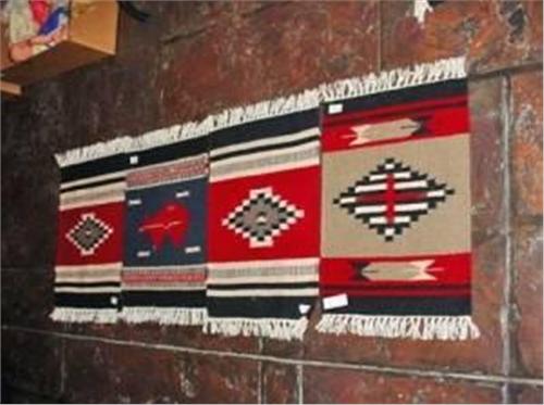 COLLECTION OF FOUR INDIAN WOVEN WOOL SADDLE BLANKET THROW MATS MADE IN MEXICO. 20"X16" IN VARIOUS DESIGNS.