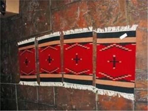 COLLECTION OF FOUR INDIAN WOVEN WOOL SADDLE BLANKET THROW MATS MADE IN MEXICO. 20"X16" IN VARIOUS DESIGNS.