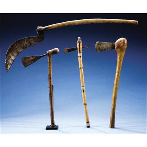 <B>COLLECTION OF FOUR VINTAGE AFRICAN TOOLS</B></I><BR> These are four vintage handmade tools from southern Africa. They are axes, used for chopping wood, as well as for protection, and come from Zambia, Zimbabwe and South Africa. The longest is 31 inches and the shortest 18 inches long, on an upright display stand.<BR><BR><b>Shipping:</b> Requires 3rd Party Shipping (<a target="_blank" href="http://www.heritageauctions.com/common/shipping.php">view shipping information</a>)