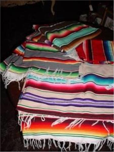 COLLECTION OF FOUR WOOL WOVEN STRIPED THROW RUGS , MADE IN MEXICO IN VARIOUS COLORS AND SIZES. 78"X48", 68"X34", AND TWO AT 52"X22".