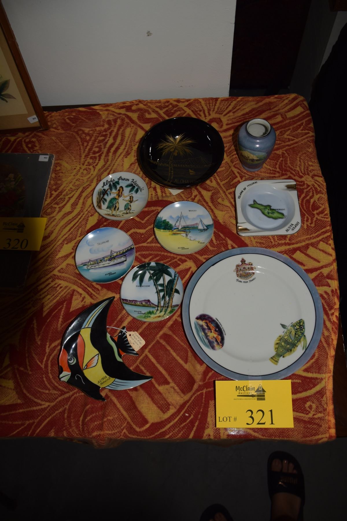 COLLECTION OF HAWAIIAN PLATES, ASHTRAY, VASE, LACQUER BOWL & FISH WALL HANGING (9 PCS)