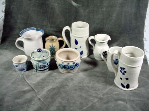 COLLECTION OF MISCELLANEOUS STONEWARE. NINE PIECES INCLUDING PITCHERS, MUGS, MUSTARDS BY WILLIAMSBERG, MAHON AND JAMESTOWN POTTERY. 3" TO 5".