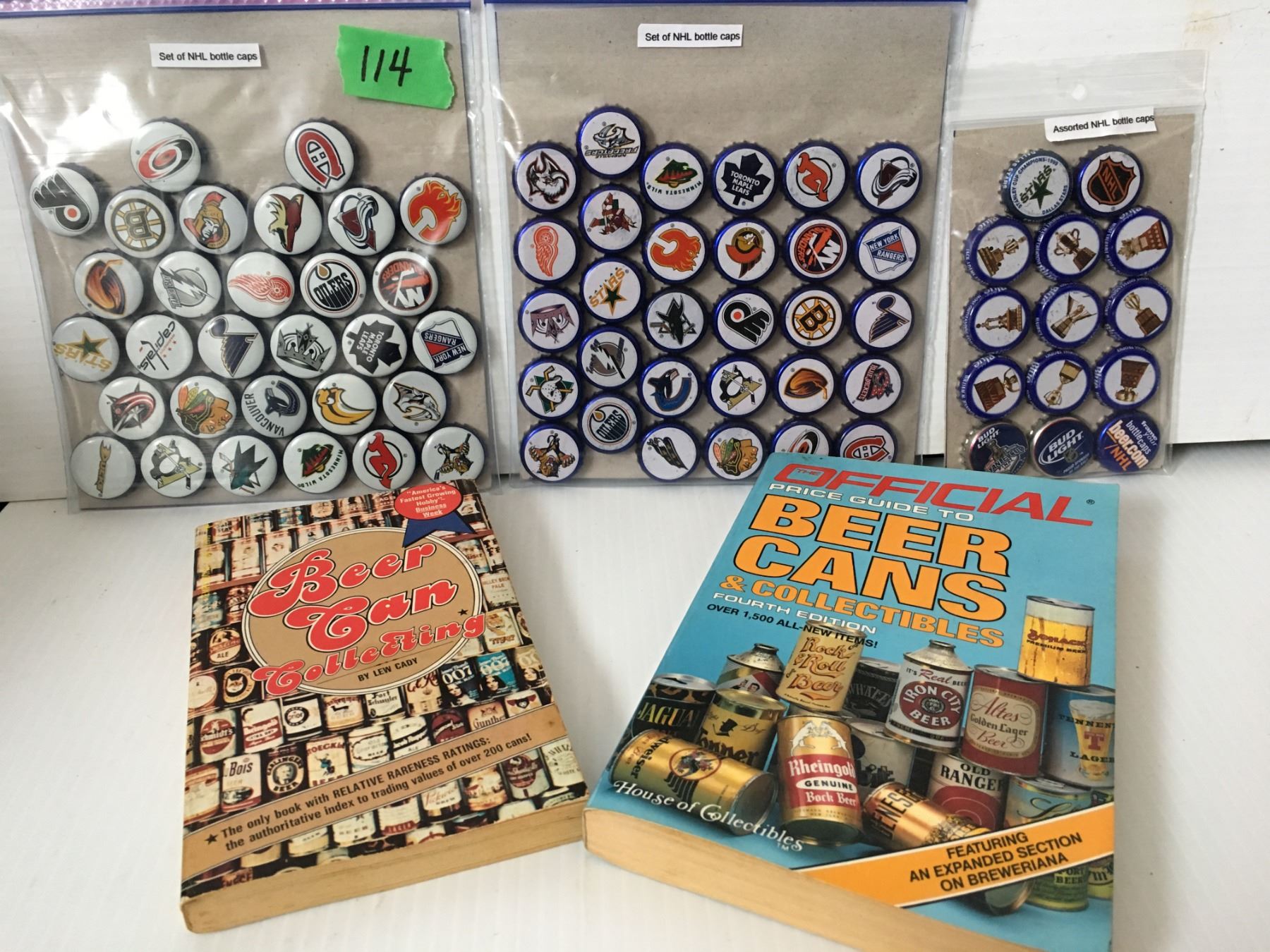 COLLECTION OF NHL BOTTLE CAPS, W/2 BEER CAN COLLECTING BOOKS
