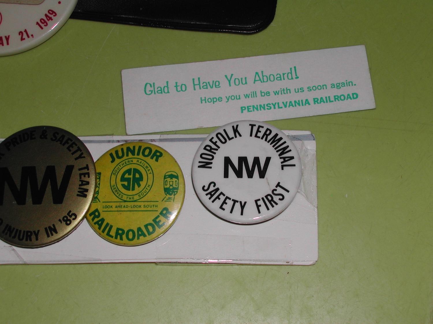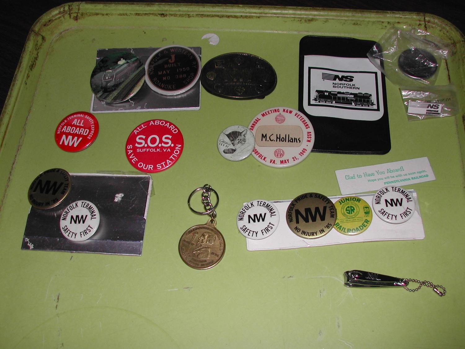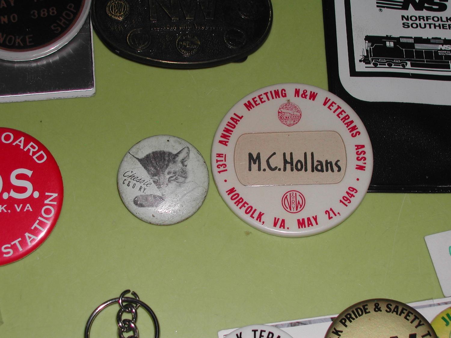 COLLECTION OF PINBACKS INCLUDING CHESSIE C&O, N&W, VETERANS ASSOC., JR. RAILROADER SOUTHERN, N&W