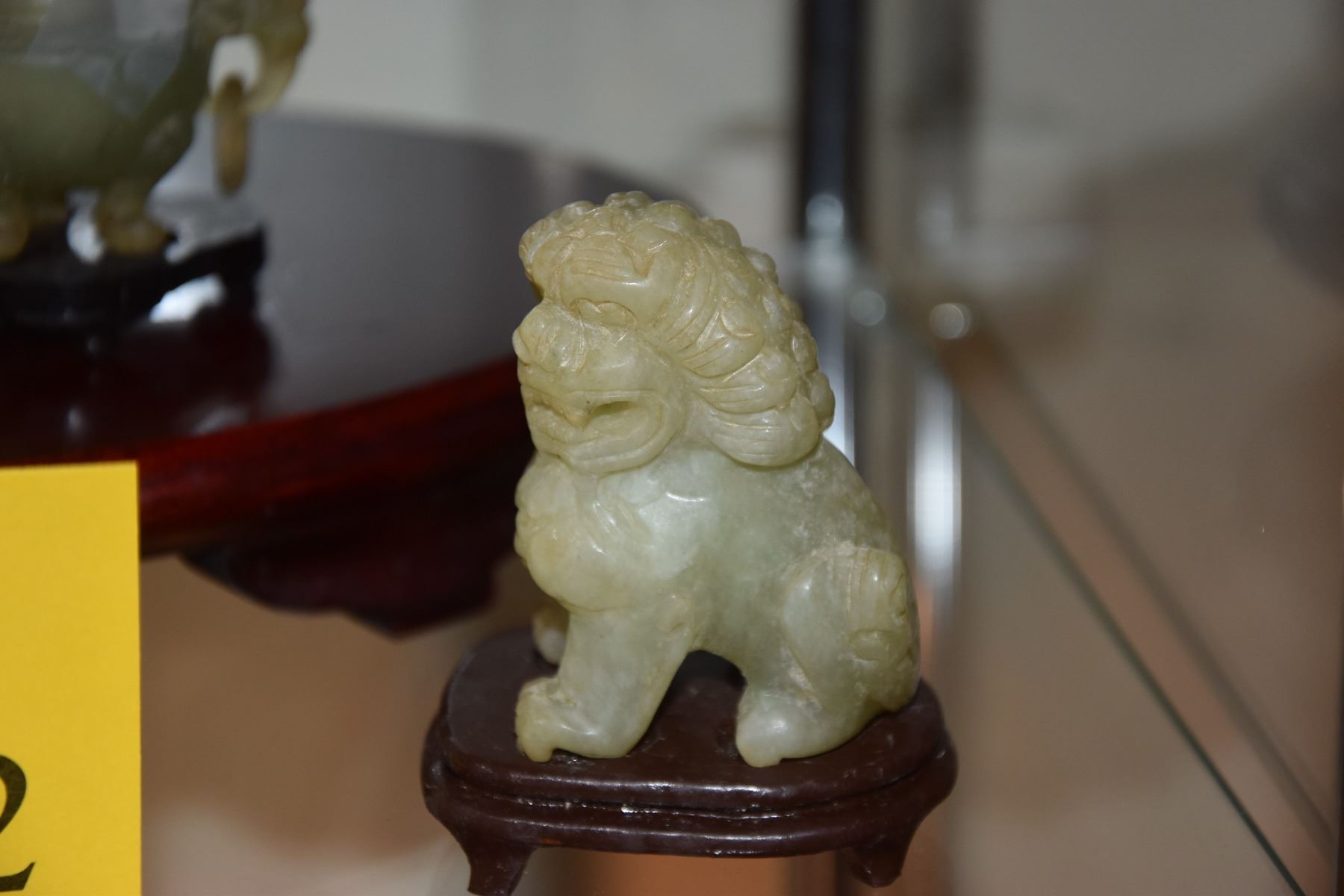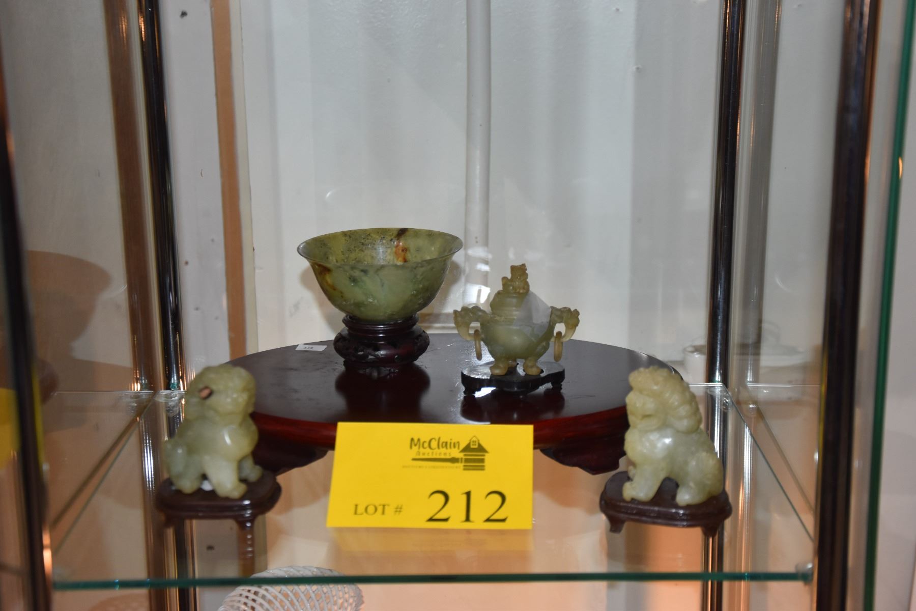 COLLECTION OF SERPENTINE JADE: FUU DOGS, CENSOR & BOWL W/STANDS (4 PCS)