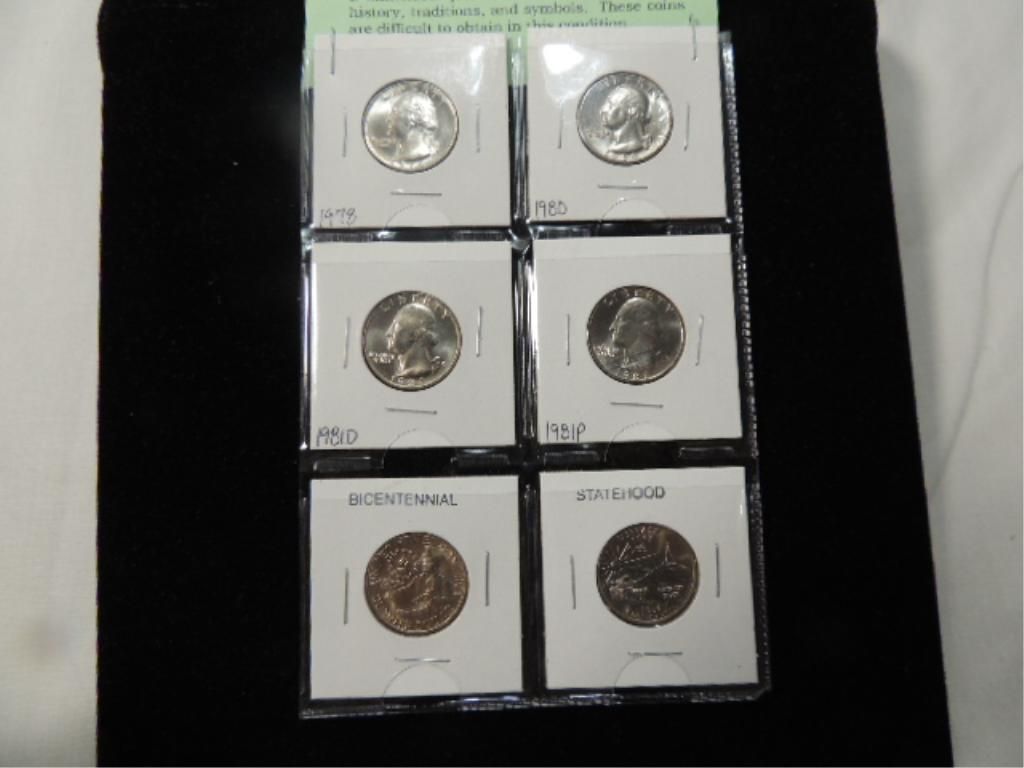 COLLECTION OF SIX DIFFERENT FRILLIANT UNCIRCULATED WASHINGTON QUARTERS. THE WASHINGTON QUARTER WAS FIRST MINTED IN 1932 TO COMMEMORATE THE 200TH ANNIVERSARY OF GEORGE WASHINGTONS BIRTH.