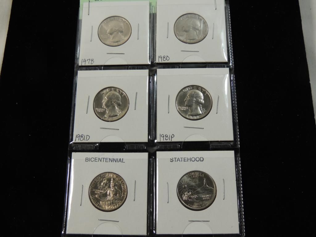 COLLECTION OF SIX DIFFERENT FRILLIANT UNCIRCULATED WASHINGTON QUARTERS. THE WASHINGTON QUARTER WAS FIRST MINTED IN 1932 TO COMMEMORATE THE 200TH ANNIVERSARY OF GEORGE WASHINGTONS BIRTH.