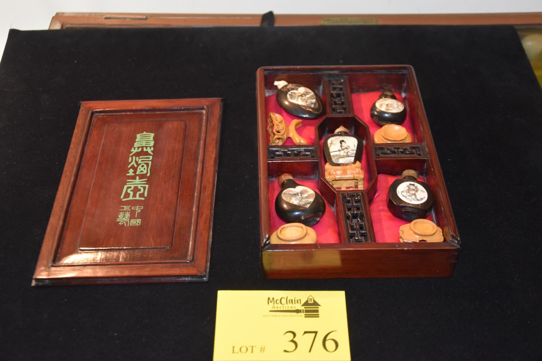 COLLECTION OF SNUFF BOTTLES W/STANDS IN ROSEWOOD CASE