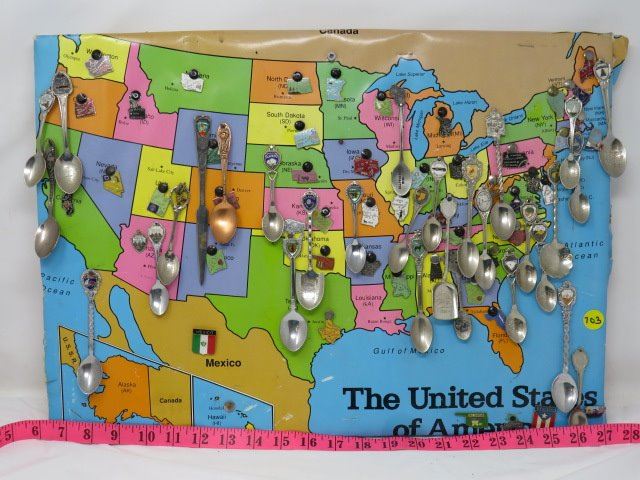 COLLECTION OF SPOONS (U.S.) MOUNTED ON WALL MAP PLAQUE