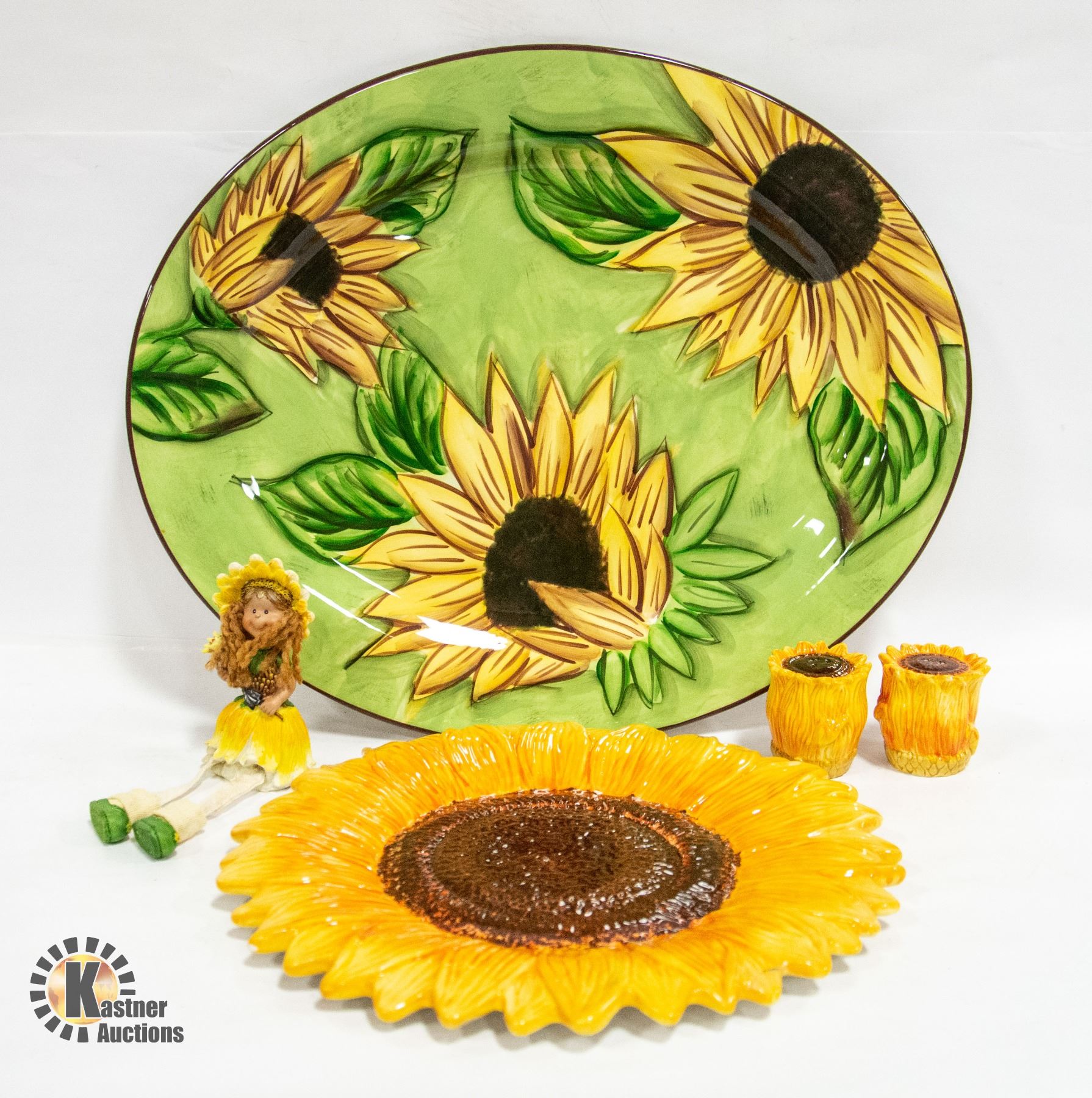 SERVING PLATTER, SERVING PLATE , MAJOLICA STYLE SALT AND PEPPER SHAKERS AND A VINTAGE SHELF-SITTER SUNFLOWER GIRL FIGURINE *HAS A CHIP **ALL ITEMS MUST BE REMOVED BY 5PM SATURDAY, JUNE 17TH 2023. ALL REMAINING ITEMS WILL BE SUBJECT TO A $6.00 PER DAY STORAGE CHARGE. ANY ITEMS REMAINING AFTER MONDAY, JULY 3RD, 2023 WILL BE CONSIDERED FORFEITED. NO REFUNDS WILL BE ISSUED FOR FORFEITED ITEMS. TO SCHEDULE A PICK UP APPOINTMENT CLICK HERE