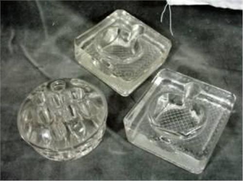 COLLECTION OF THREE GLASS ITEMS INCLUDING A ROUND FLOWER FROG 1.5"X3" AND TWO INK-WELLS WITH CAPS FOR EACH 1.25"X3"X3".